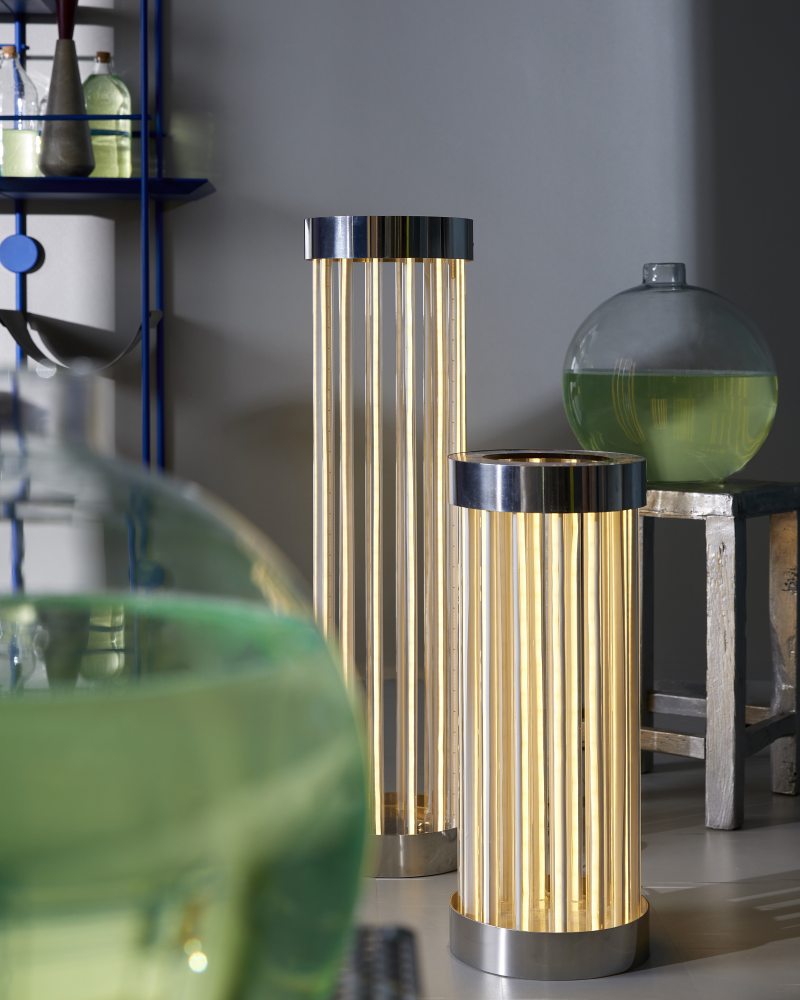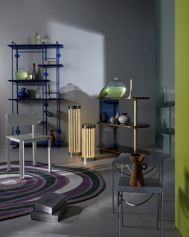 Ambiente que materializa A CibernéticaEstante @f.studio_design; sobre ela, objetos @nodacozinha e @alva_design; cadeira @c.l.u.b.e. e @luizsolano_; luminárias @athas_design; carrinho @bianca_barbato; sobre ele, objetos @nodacozinha, @alva_design e @universo.produtos; mesinhas laterais @luisaattab; sobre ela, castiçal @aterraestudio; livros (prateados) @bianca_barbato; tapete @lolamuller; pisos @tarkettbrasil