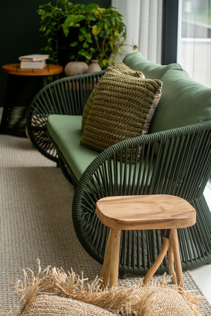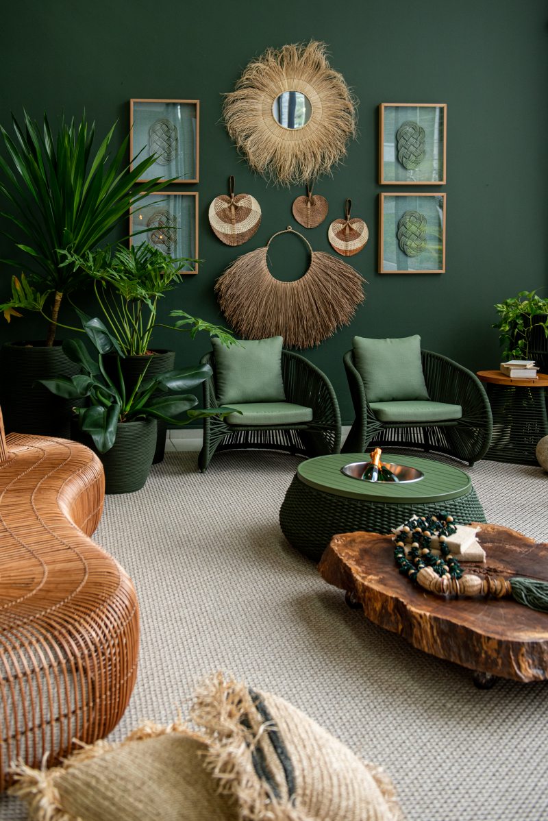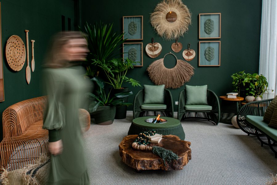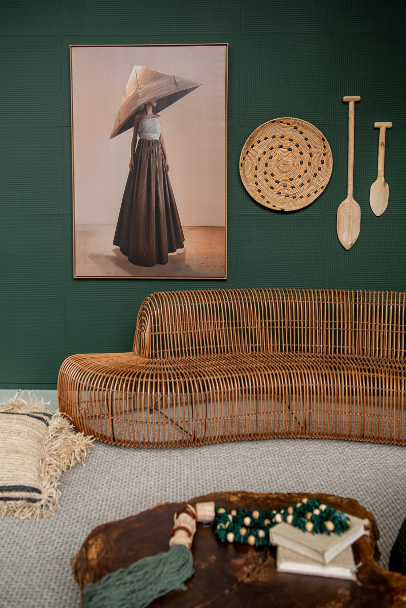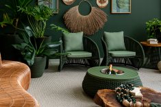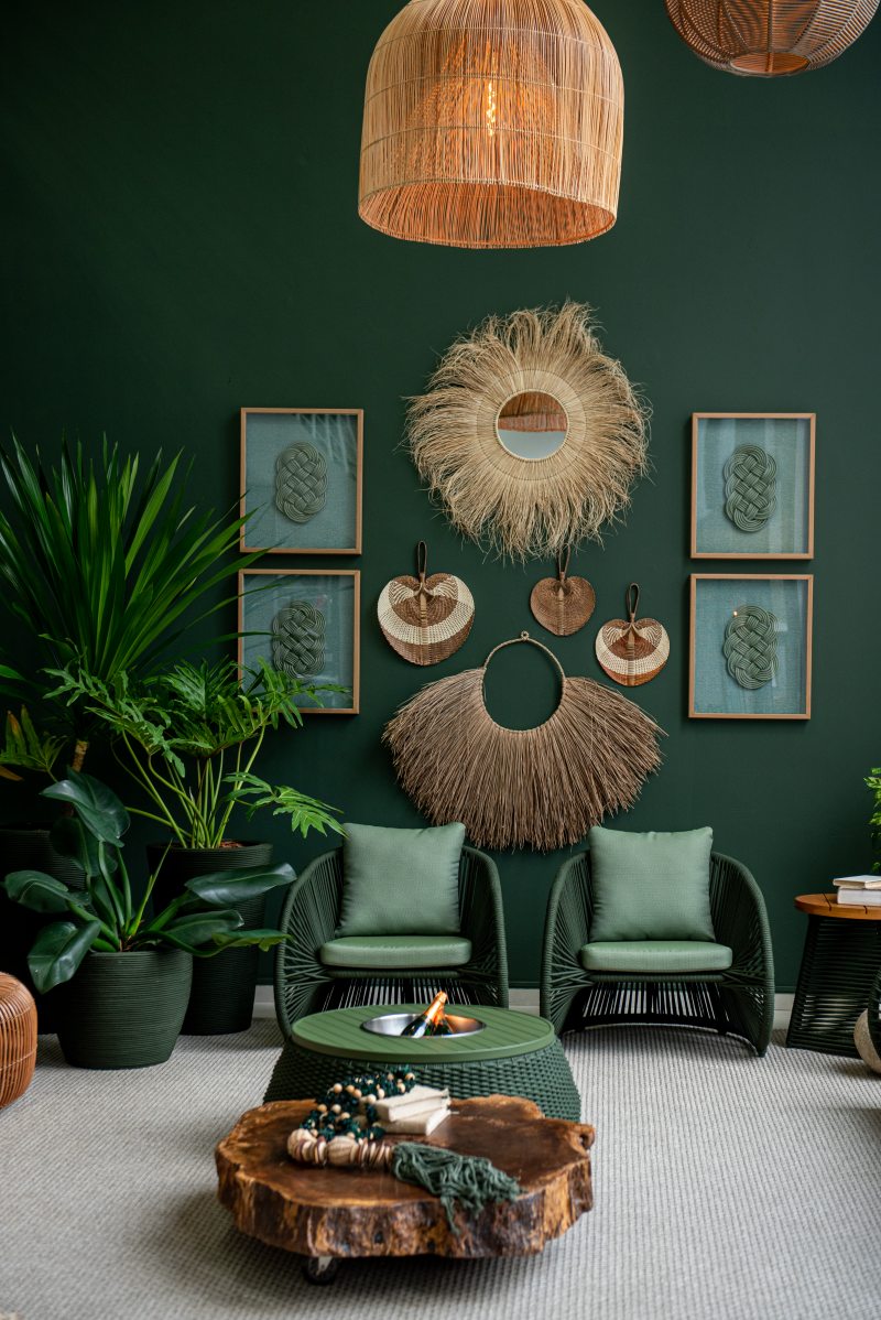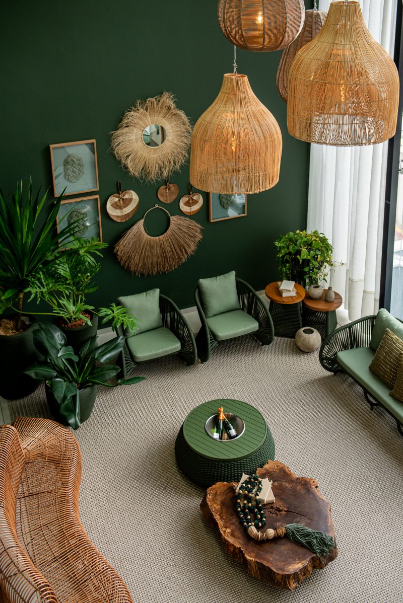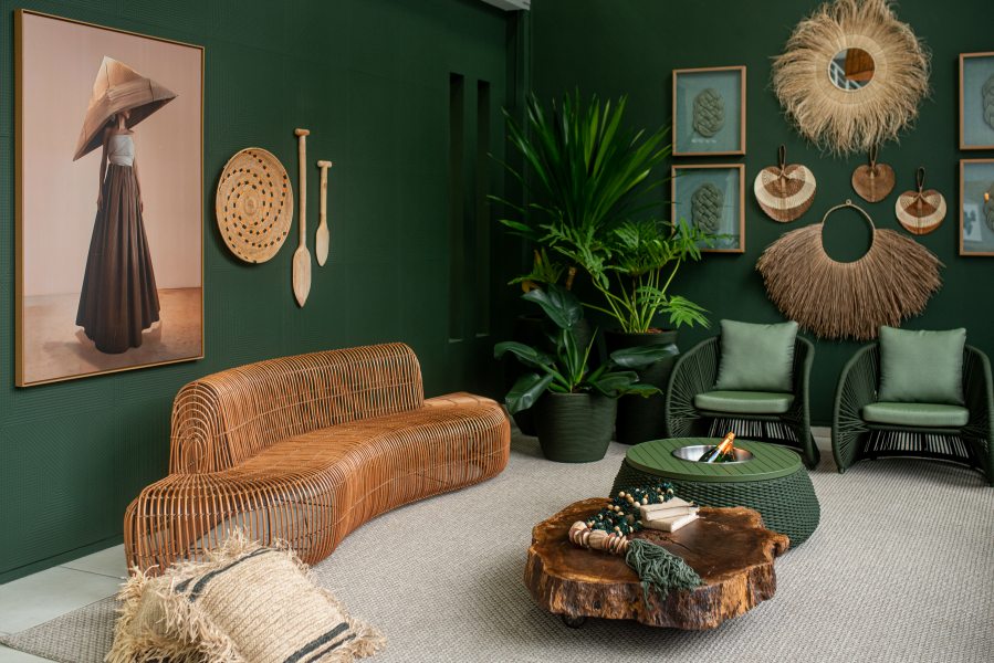 Com inspiração na Natureza, Luciana buscou no verde a sensação de paz e relaxamento presentes em suas memórias de férias na fazenda e trouxe elementos rústicos aplicados com elegância como o sofá em fibra natural e a mesa de centro em madeira bruta que deixou o espaço ainda mais acolhedor. Em um grande living, os sofás com linhas predominantemente curvas em tonalidade verde criam um espaço fluído e harmonioso arrematado por vasos e plantas que garantem a energia e vitalidade do espaço. A mesa de centro champanheira é um convite a esta celebração. “A Raffinato evoluiu muito ao longo desses 23 anos, e esta busca por evolução contínua pode ser percebida em seus produtos através do design, da qualidade e da versatilidade que busco para dar personalidade aos meus projetos.” comenta Luciana Baggio.