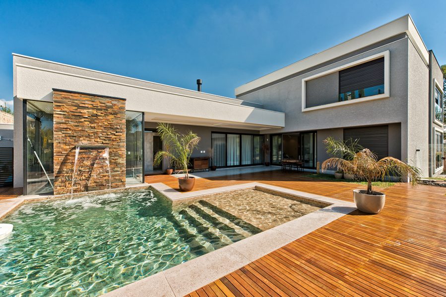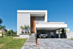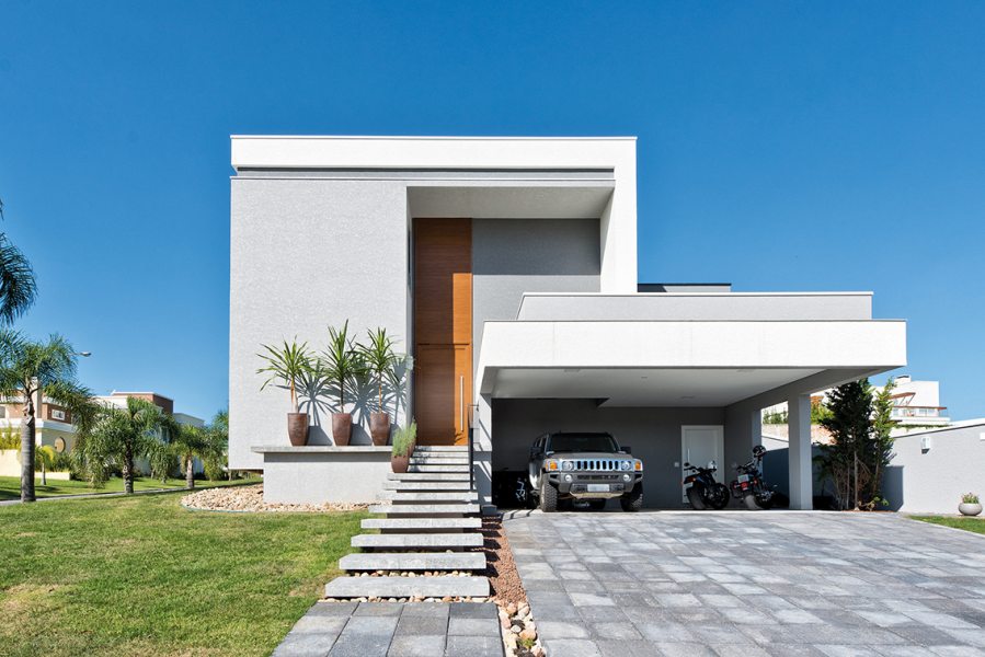 Um projeto contemporâneo, com volumetria, movimento e elementos naturais. Assim é a residência de 438 m² projetada pelo arquiteto Boris Tkotz, localizada no bairro Alphaville, em Pinhais. A fachada foi trabalhada com tonalidades de cinza e preto, realçadas pelas grandes esquadrias de PVC (Europa Esquadrias de PVC) com acabamento preto no exterior e branco no interior, além de elementos naturais como pedra e madeira.