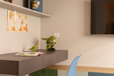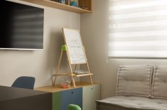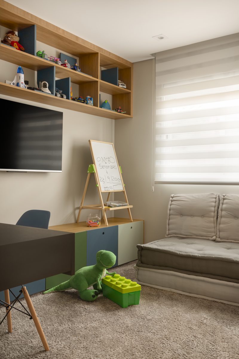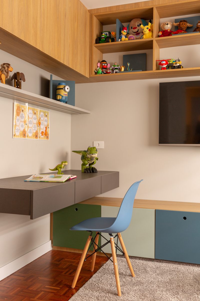 Nos ambientes íntimos, a suíte do pequeno morador merece destaque especial. Na brinquedoteca as arquitetas usaram gavetões coloridos de madeira e elementos lúdicos para personalizar o décor e estimular a organização.
