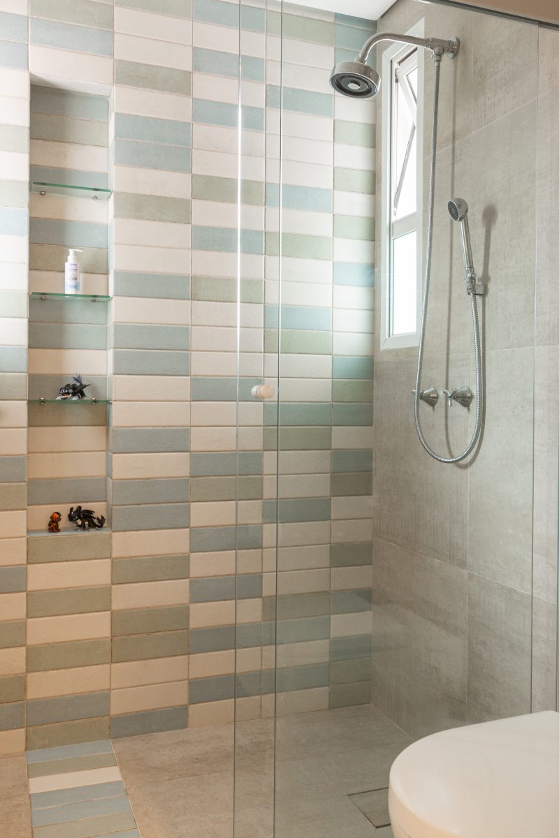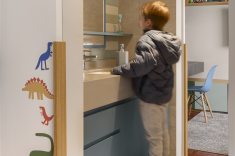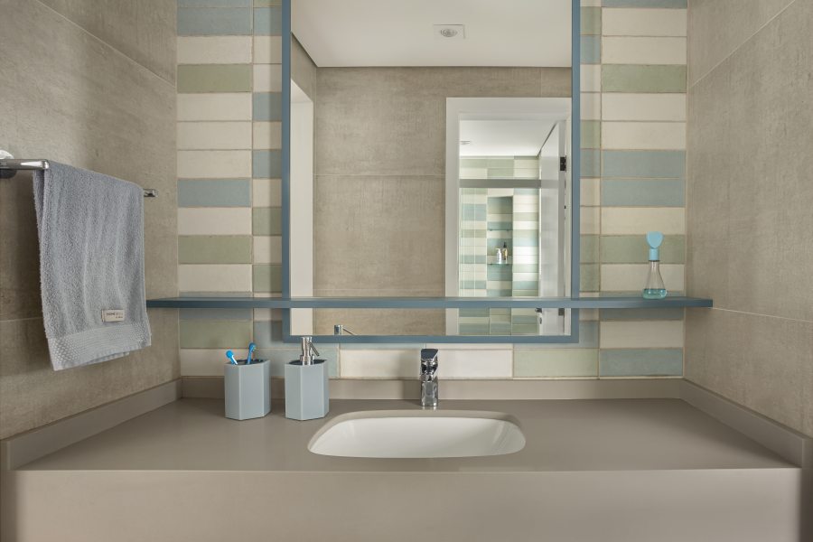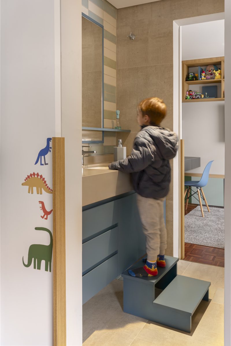 Soluções criativas, como a escadinha móvel sob a pia do banheiro, garantiram maior autonomia na hora da higiene pessoal.
