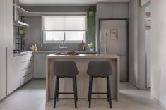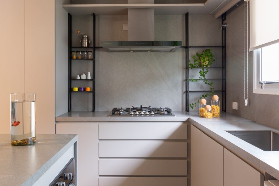 A cozinha sob medida finaliza a área social garantindo a praticidade da rotina familiar por meio de revestimentos de fácil limpeza e mobiliário sob medida funcional.