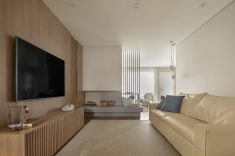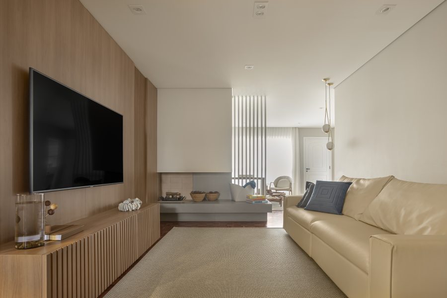 Na sala de estar, a textura acolhedora do tapete de seda indiana, da Persépolis, oferece uma base elegante para os estofados e almofadas em tons terrosos em frente à parede de tijolinho cimentício. Na sala de TV, o mobiliário sob medida de madeira clara foi combinado a uma lareira à lenha reaproveitada da antiga residência, redesenhada pelas arquitetas e revestida com placas isolantes e porcelanato para se tornar destaque do décor.