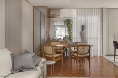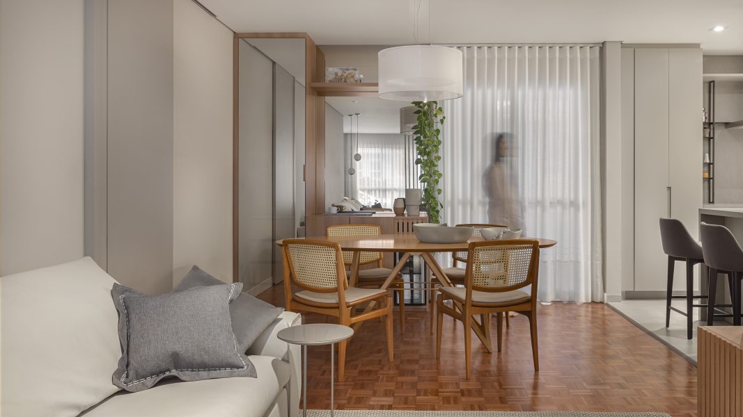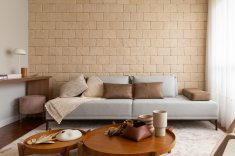 Felizmente, graças ao projeto de renovação idealizado e conduzido pela Lumi Arquitetura, os moradores já contam com um novo lar confortável e funcional para ajudar a construir suas novas memórias. O layout segmentado do imóvel, construído em 2009, foi substituído por uma nova área social ampla e integrada. Todos os revestimentos e acabamentos antigos, à exceção do piso de tacos de madeira, foram trocados por opções atuais dentro de uma paleta de cores em tons terrosos.