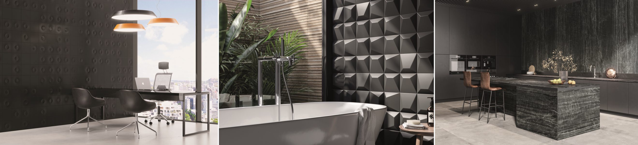 “O ideal é buscar uma harmonia ao utilizar um revestimento preto, para não pesar no ambiente. Linhas tridimensionais agregam ainda mais complexidade”, explica Christie. “Assim, os espaços se tornam refinados e aconchegantes”, sumariza.
