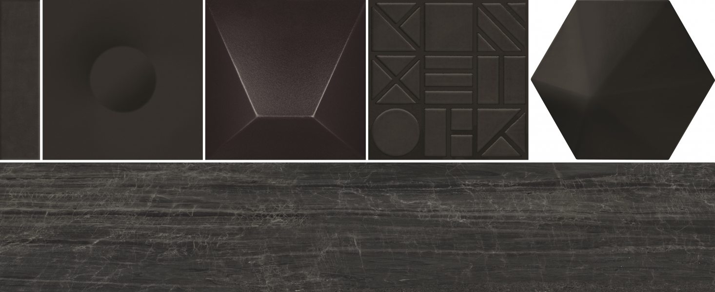 Em seu portfólio, a Roca Cerámica conta com diversas linhas que exploram esse tom. São peças que ainda brincam com a tridimensionalidade, como a linha Quasar, Block e Pure, ou trazem grafismos impactantes, como a Forma. O mármore negro, exótico e extremamente luxuoso, também pode ser encontrado em linhas como a Nero Caresi. Formatos clássicos também receberam uma versão preta, como a linha Fit, que evoca o english brick.