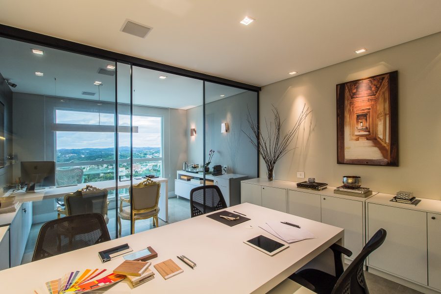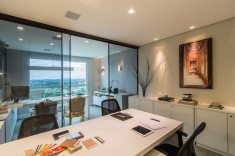 Para o projeto de seu escritório em Curitiba, com vista para um dos cartões-postais da cidade - o parque Barigüi - a designer de interiores Xenia Sperandio utilizou o que o mercado traz de melhor em materiais e produtos. O espaço original, que contava somente com contra-piso e laje aparente, ganhou forma em apenas trinta dias. “Apesar de ser um escritório, queria que a iluminação, junto aos demais acabamentos, trouxessem conforto visual, tranquilidade, acolhimento e aconchego”, comenta a profissional. A paleta em tons off-white e preto ganhou toques metalizados em cobre e dourado. Um dos pontos altos do projeto é o painel Movie, da Cinex, que possui a funcionalidade de uma TV de última geração e, quando desligado, permite que o televisor fique imperceptível atrás do vidro escuro.