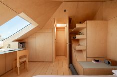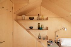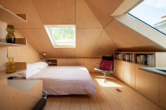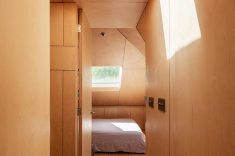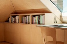 Neste projeto a madeira envolve continuamente paredes, tetos e elementos embutidos, criando uma sensação de encerramento que transmite estabilidade e calma. As superfícies revestidas com placas de MDF funcionam como um gesto único e contínuo. As junções são cuidadosamente resolvidas, permitindo que o desenho fale por meio da precisão. A uniformidade do material dilui a complexidade da geometria e transforma a inclinação do telhado em elemento organizador. O mesmo material reveste a marcenaria feita sob medida.