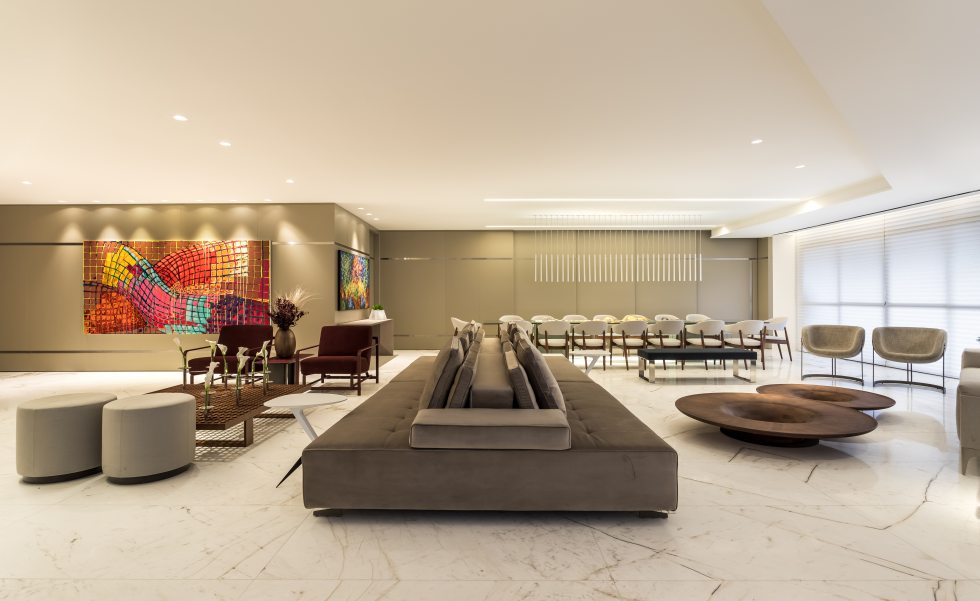 Hoje em dia as fronteiras entre espaços “comerciais” e “residenciais” estão cada vez mais tênues. Na era do home office cabe aos profissionais de arquitetura e design criar ambientes cada vez mais versáteis e adaptados aos novos tempos. Este foi o desafio da arquiteta Flávia Bonet ao reformar este apartamento de 890m² no Água Verde, em Curitiba. O cliente, morador do imóvel, desejava realizar reuniões comerciais com conforto e entreter parceiros de negócios do mundo todo na sua sala de estar.