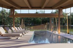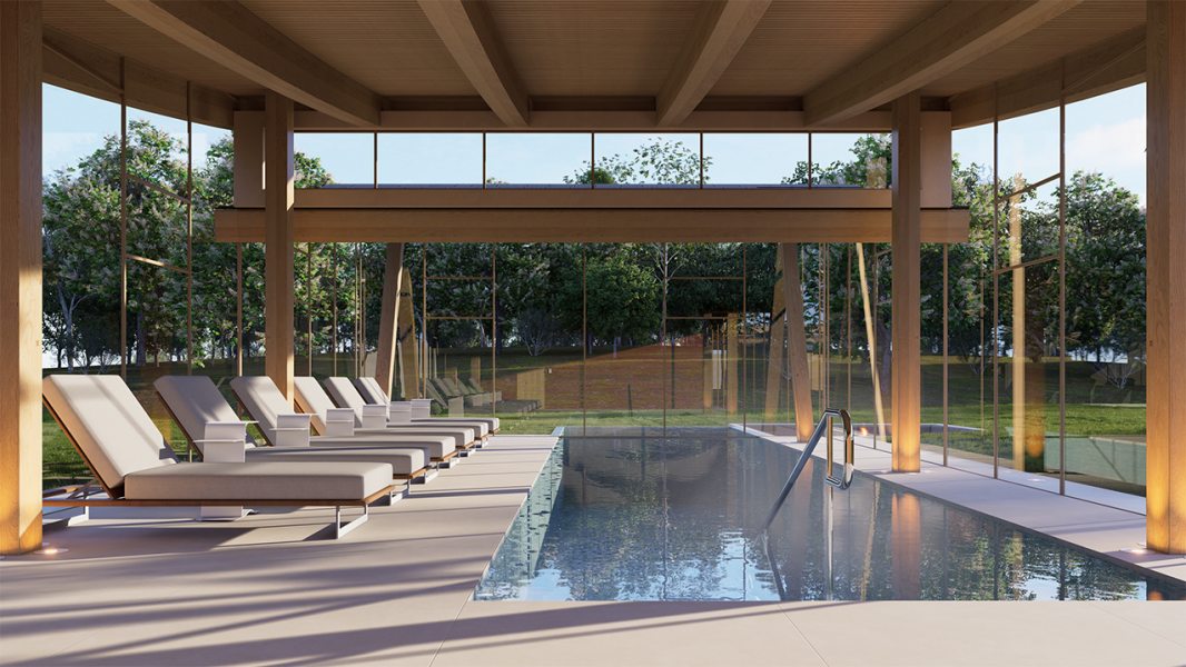 A infraestrutura do condomínio inclui portaria 24 horas, piscina coberta e aquecida, espaço voltado ao corpo e ao relaxamento, sala de massagem, trilhas na mata, paisagismo integrado à floresta e acesso direto ao rio Nhundiaquara.