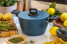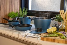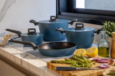 O jogo de panelas completo conta com quatro opções com design moderno, perfeitas para equipar e dar um toque de estilo na cozinha. São três caçarolas, com capacidades para 1,6 litros, 2,2 litros e 5,5 litros, e uma frigideira, de 1,8 litros, que garante versatilidade e funcionalidade tanto para preparos rápidos quanto refeições gourmet.