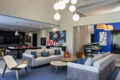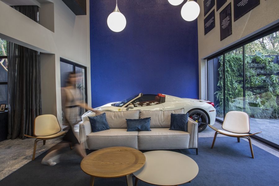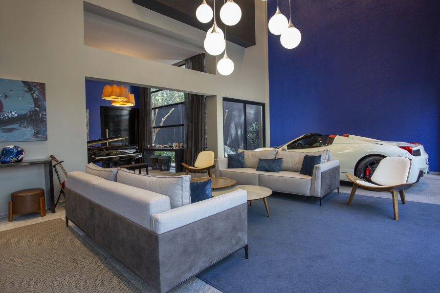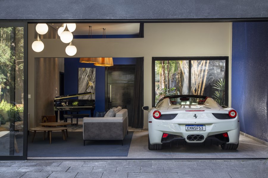 Pensada para refletir os gostos pessoais do proprietário – um jovem empresário apaixonado por cores, carros esportivos e reuniões com os amigos – a antiga garagem da residência foi convertida em uma área de lazer cinematográfica.