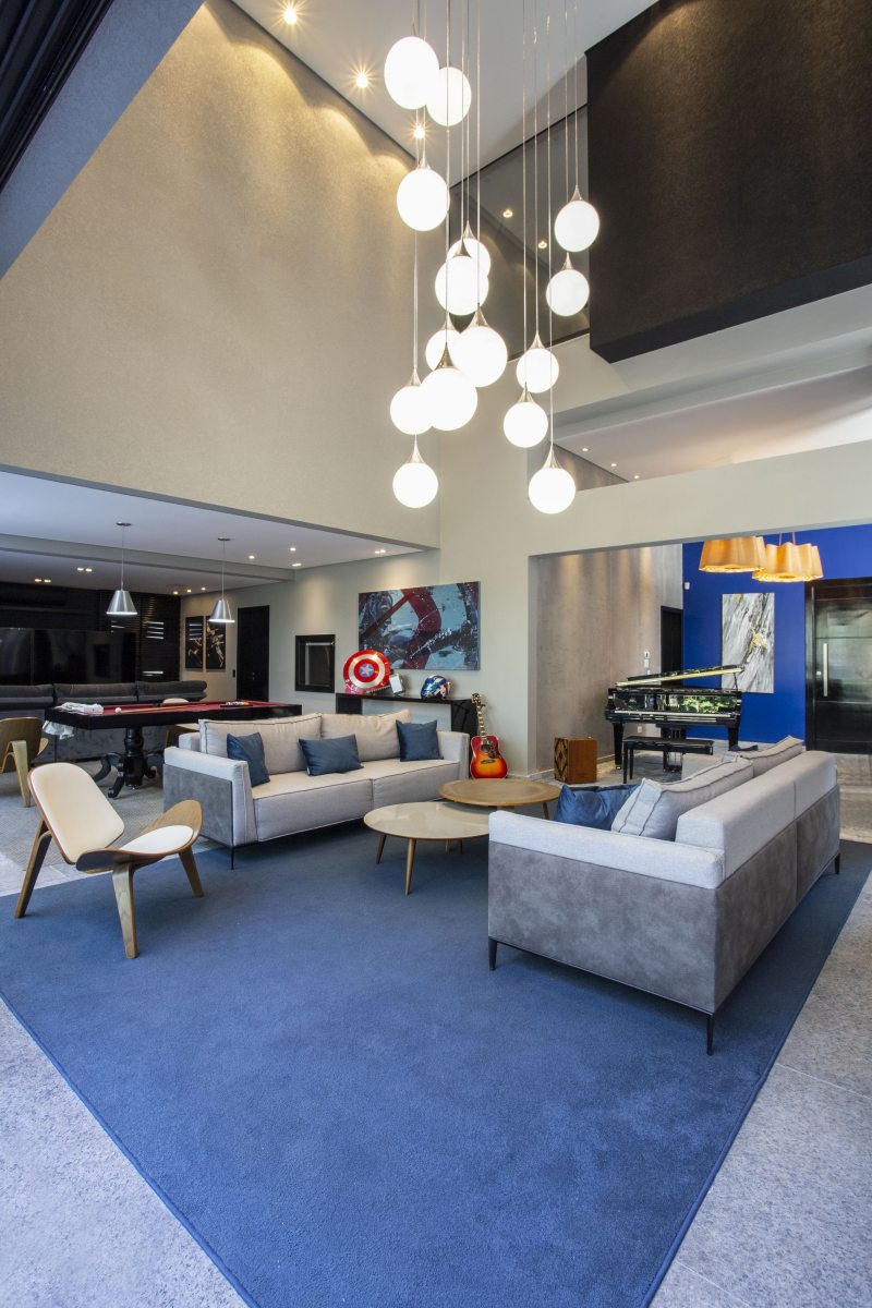 A área social com projeto da Villarq Arquitetura poderia facilmente ser o lar de um super-herói dos quadrinhos ou o cenário de um filme de espionagem.