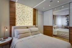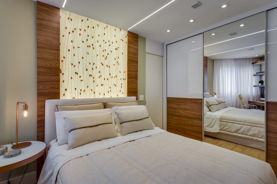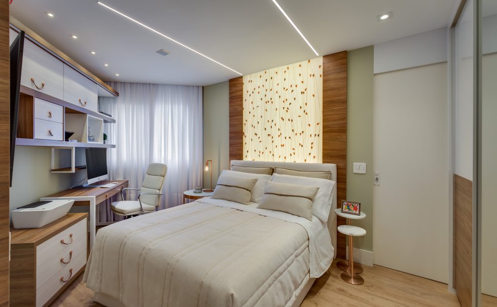 O destaque do espaço é o painel Sustentável Retroiluminado 3Form, da Hunter Douglas, feito em Ecoresin - uma resina de eco-poliéster produzida de forma artesanal com a aplicação de flores e folhas secas naturais que foi aplicado na cabeceria da cama.