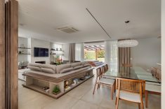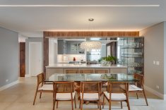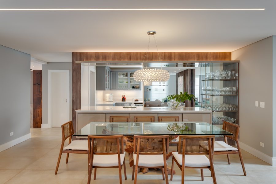 A solução foi integrar a sala de jantar e de estar em um único espaço, que funciona também como hall de entrada. Uma divisória vazada em MDF da Masotti Curitiba preserva a intimidade sem prejuízo à integração com a churrasqueira, permitindo alterar a configuração do ambiente conforme a ocasião. A sala de jantar, por sua vez, se conecta à cozinha por meio de um móvel projetado especialmente pela arquiteta, desempenhando as funções de cristaleira e buffet. Outro destaque é a mesa de jantar, escolhida cuidadosamente junto a uma empresa especializada: “A Boulle Móveis de Fundamento busca a madeira nas regiões mais remotas da América Latina: árvores que caíram naturalmente, madeiras que estavam submersas em rios e represas e peças antigas, sempre de origem sustentável e ecologicamente correta.” – explicou a arquiteta.