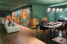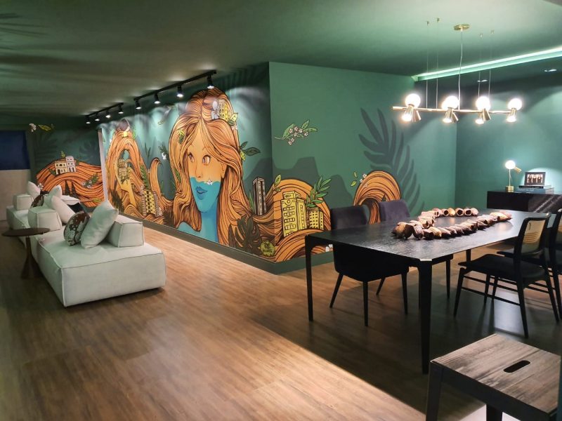 O ambiente Estar e Jantar Refúgio do trio Ediane Tramujas, Camila Rocha e Paula Fuzeto, surpreende com uma atmosfera acolhedora nos 62 m². O bem-estar do espaço resulta na escolha do verde que predomina nas paredes e no teto, o que remete à natureza. Em homenagem a Curitiba, o espaço contemporâneo conta com paredes grafitadas com paisagens da região do ilustrador Gusta. Os elementos que remetem a brasilidade são encontrados no colar de mesa cacau; na cadeira Golf, produzida com encosto em palhinha; no puff Nó, assinado pela designer mineira Eliza Atheniense, todo mobiliário da Villa Batel Décor.