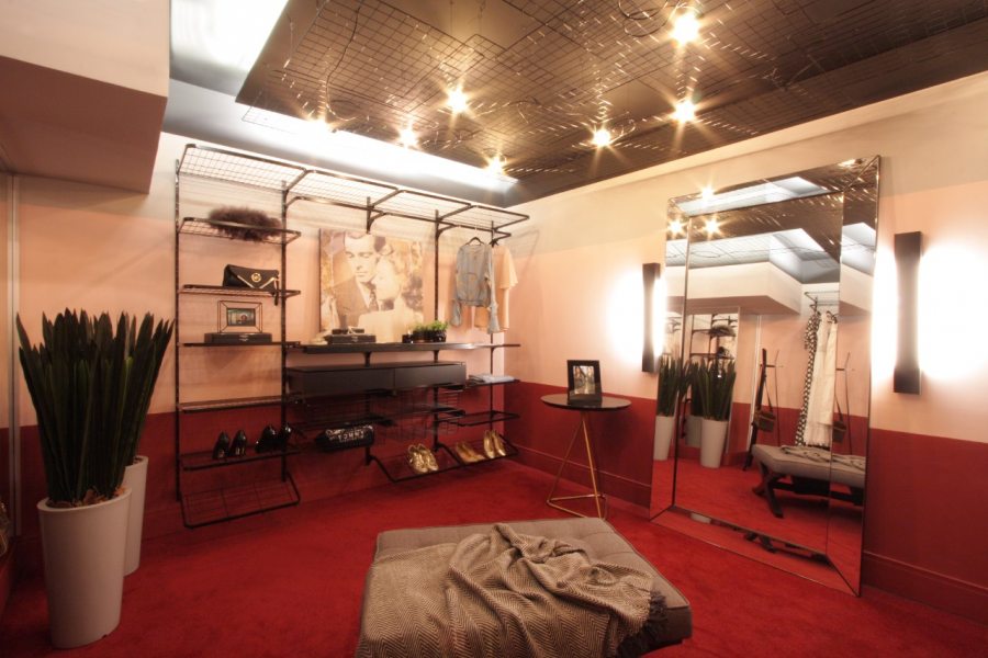 O conceito aberto do closet de 16 m², foi inspirado na modelo e apresentadora Tati Crespa. As profissionais Laryssa Rocha e Cléo Moura trabalharam com cores em listras monocromáticas em duas versões. O carpete vermelho valoriza o espaço e predomina a união das linhas continuas da pintura da parede, contrapondo-se ao teto. A iluminação foi o grande destaque, pois valoriza o espaço junto as telas metálicas que apresentam uma estética urbana ao closet. Os produtos de iluminação são da Grey House, loja de iluminação que também faz parte das marcas que estão na Villa Batel Décor.
