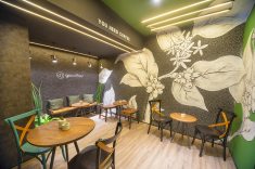 O espaço Go Coffee, assinado por André Henning, é o lugar pensado para os visitantes que quiserem dar uma pausa e aproveitar o café em um ambiente que proporciona um momento de relaxamento. Os contrastes de cores entre o verde, preto, branco e elementos naturais, trazem um refúgio em meio à cidade. O destaque é encontrado no papel de parede texturizado, em reprodução de ganilite. O cimento queimado com sobreposição de grafites reproduz o conceito urbano. O espaço contou com papéis de parede das coleções Milano e Atelier, da StilHaus, loja de tecidos e papéis de parede dentro da Villa Batel Décor.