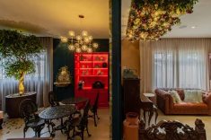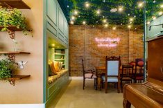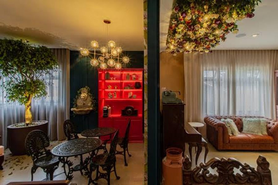 No décor, a referência vintage da construção antiga dialoga com as peças garimpadas de antiquários, como a porta principal, que tem mais de um século de história e que, em conjunto com um sofá retrô, torna-se cenário para um cantinho de leituras. As cadeiras também carregam memórias do século passado, algumas com origem portuguesa ou provençal. O toque final fica por conta da árvore Ficus, das plantas naturais e dos arranjos florais no teto.