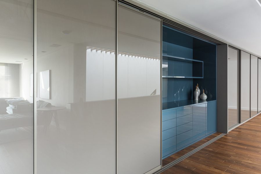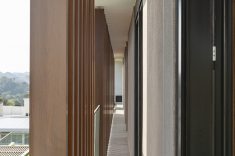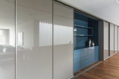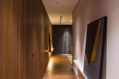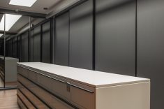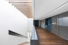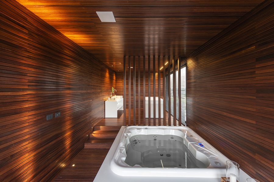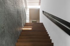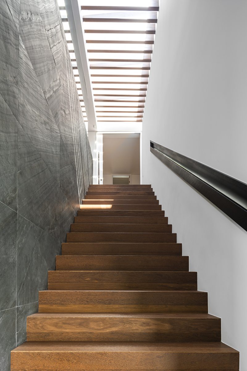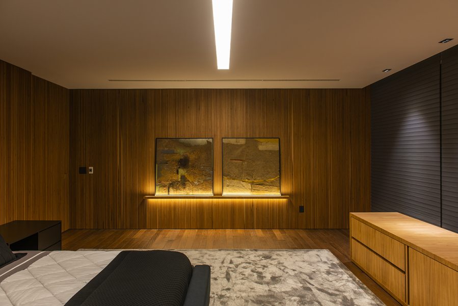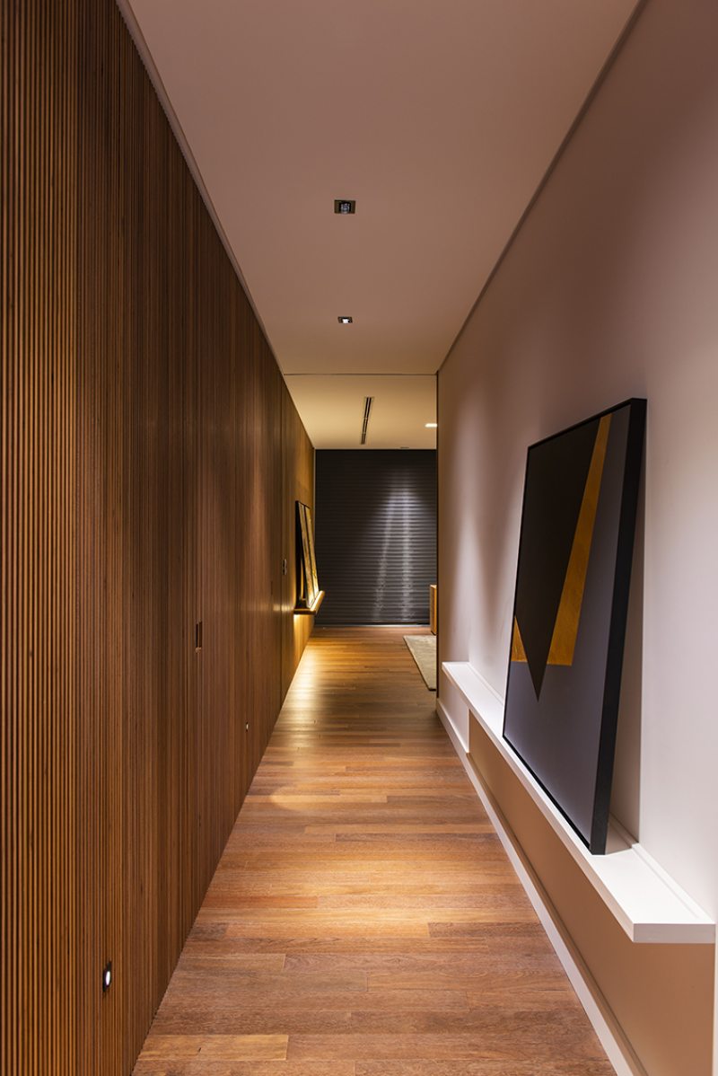 Uma bela escadaria com abertura zenital acessa o segundo grande bloco construtivo da residência. Distribuída ao longo do primeiro pavimento, a área íntima inclui suítes, SPA e estar íntimo. O espaço de circulação entre os dormitórios ganhou móveis sob medida e portas corrediças em laca polida, funcionando como roupeiro e copa de apoio. O piso de madeira natural confere aspecto acolhedor aos diversos espaços, servindo também como revestimento de paredes na suíte máster e no SPA. O resultado final ficou exatamente o que os proprietários desejavam. “Eles amaram o resultado. O casal até renovou votos de casamento numa cerimônia para a família no jardim da residência.” – comemorou a arquiteta. Final feliz para a família (e para um projeto arquitetônico incrível).