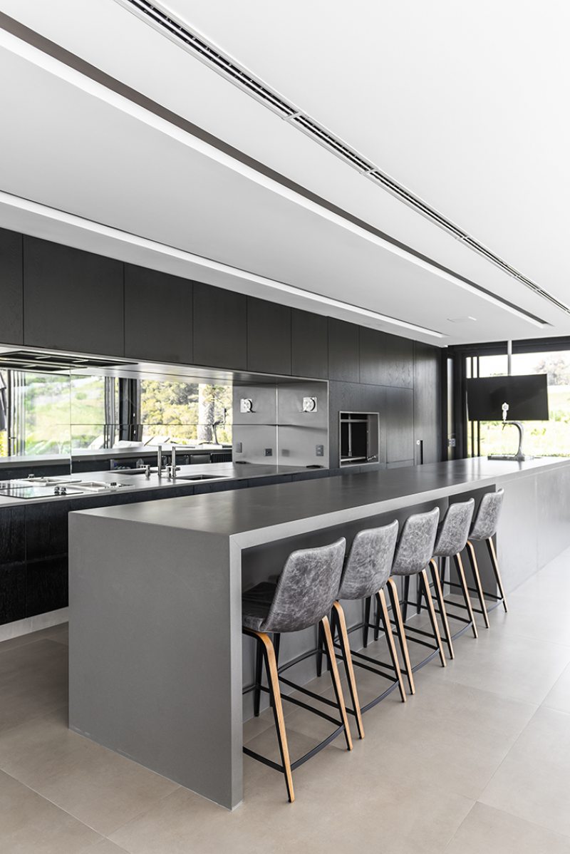 O grande volume de pedra que ocupa a frente da residência, além da importância estética, serve para ocultar a área de serviço composta por cozinha e lavanderia. A partir desta solução o layout foi distribuído ao longo dos dois grandes blocos construtivos: o primeiro, no térreo, ganhou sala de estar, espaço gourmet e área de lazer com piscina para atender ao desejo da família de receber família e amigos com conforto. O décor moderno e o mobiliário da Inove Design garantiram que a arquitetura arrojada das fachadas fosse transportada para os interiores da área social. O aspecto moderno das cadeiras grafite e da mesa de centro em metal escuro forneceram um belo complemento à paleta de cores neutra contrastante com o colorido do paisagismo e da piscina de borda infinita.