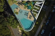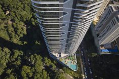 Essa variação deliberada da arquitetura faz com que o edifício se afaste da lógica tradicional, oferecendo espacialidades que remetem à experiência de viver em uma casa térrea: interiores mais altos, áreas sociais conectadas a terraços profundos e uma percepção contínua da paisagem. A intenção não é apenas estética. Ao permitir que cada tipologia dialogue com a orientação do sol, com o recorte do terreno e com o próprio ritmo da fachada, o projeto cria unidades que se diferenciam umas das outras sem perder a coerência do conjunto.