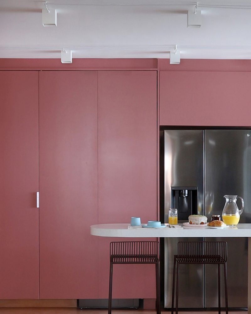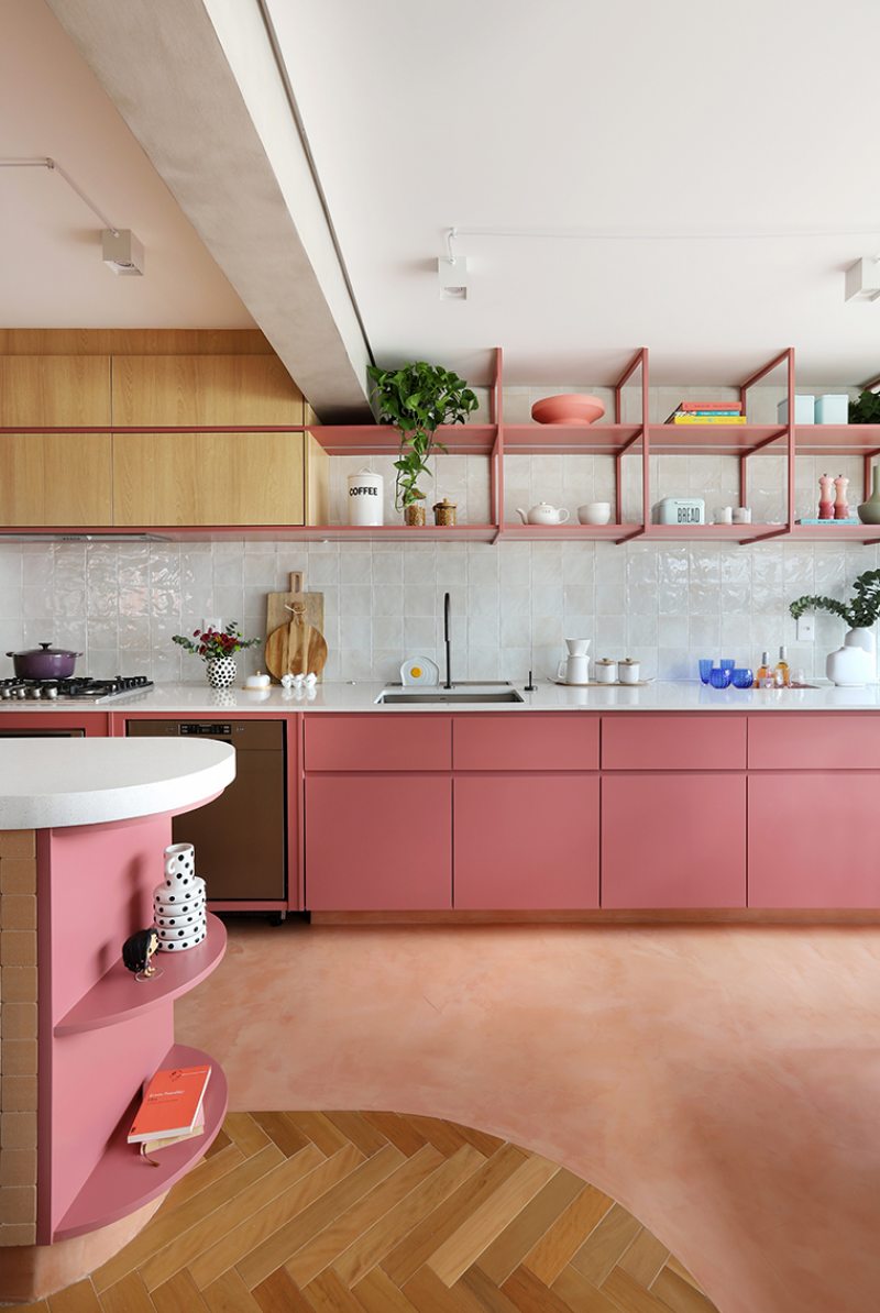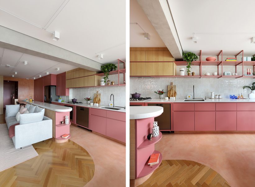 A cozinha, integrada à área social, concentra a aplicação mais intensa da cor. Toda a marcenaria recebeu acabamento em laca na cor Salão Rosa, repetida na serralheria e nas prateleiras. Armários suspensos em MDF Carvalho da Arauco apresentam frisos em rosa. Para diferenciar os usos, o piso recebeu paginação curva e contínua, conectando os ambientes.