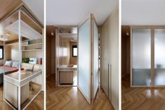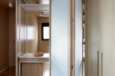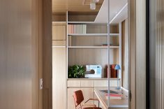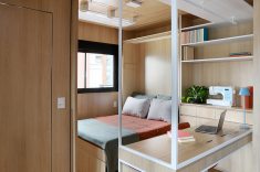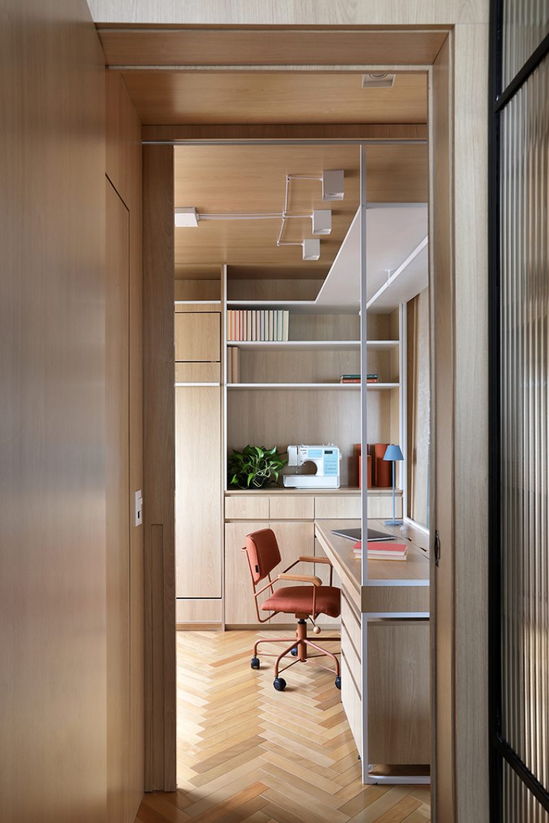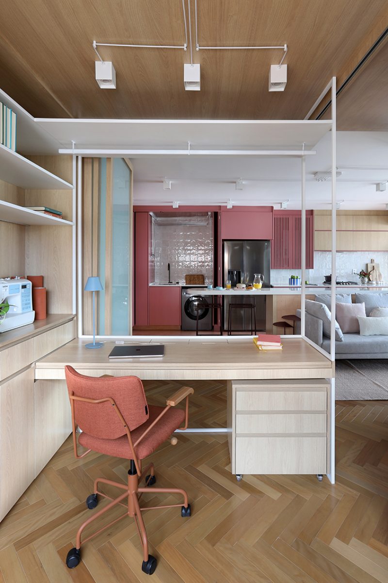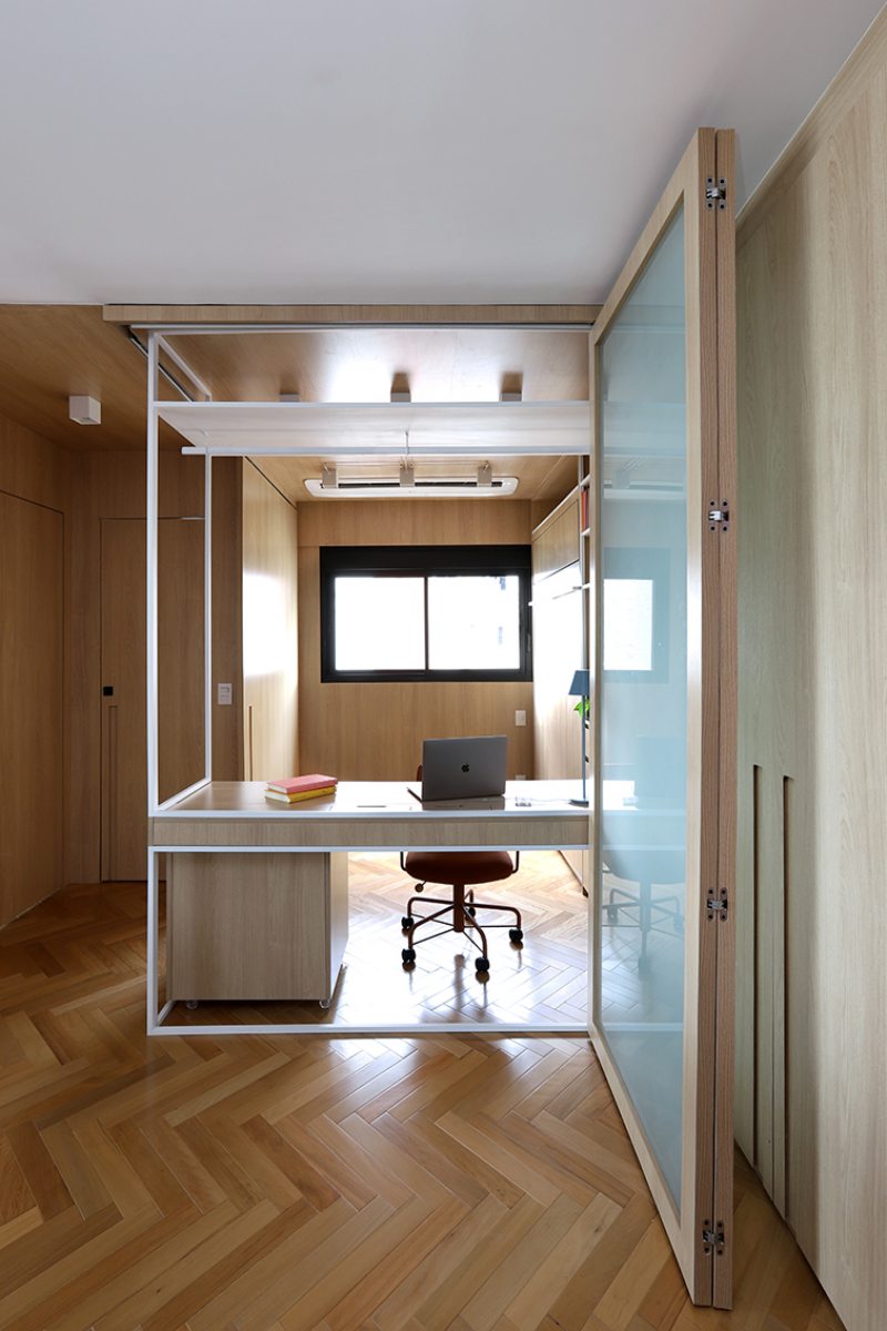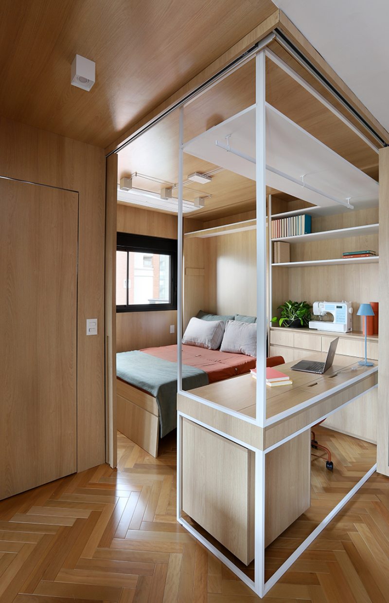 A bancada conta com gavetas, compartimentos para armazenar notebook e objetos menores, além de tomadas embutidas e ocultas. No mesmo ambiente, uma cama de casal fica embutida em um móvel com acabamento em MDF Carvalho da Arauco, permitindo o uso do espaço tanto como área de trabalho quanto como dormitório para hóspedes. Quando utilizado como quarto, um sistema de portas em camarão faz o fechamento do ambiente, garantindo privacidade sem interferir na área social.