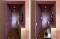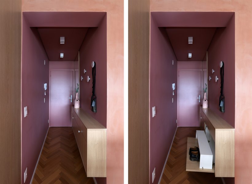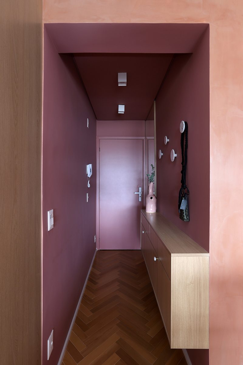 A principal diretriz do projeto foi otimizar a planta por meio de marcenaria planejada. O mobiliário fixo, todo desenhado pelo escritório, organizou espaços, criou áreas de armazenamento e ocultou ambientes técnicos, permitindo que o apartamento funcionasse de forma flexível ao longo do dia. O rosa aparece em diferentes tonalidades e é utilizado como elemento de identidade e continuidade visual. Logo na entrada, um hall em color block rosa escuro marca a transição para a área social. Nesse espaço, um móvel em MDF Carvalho da Arauco funciona como sapateira e aparador, acompanhado por penduradores em pedras naturais. A porta de entrada foi laqueada no mesmo tom das paredes.