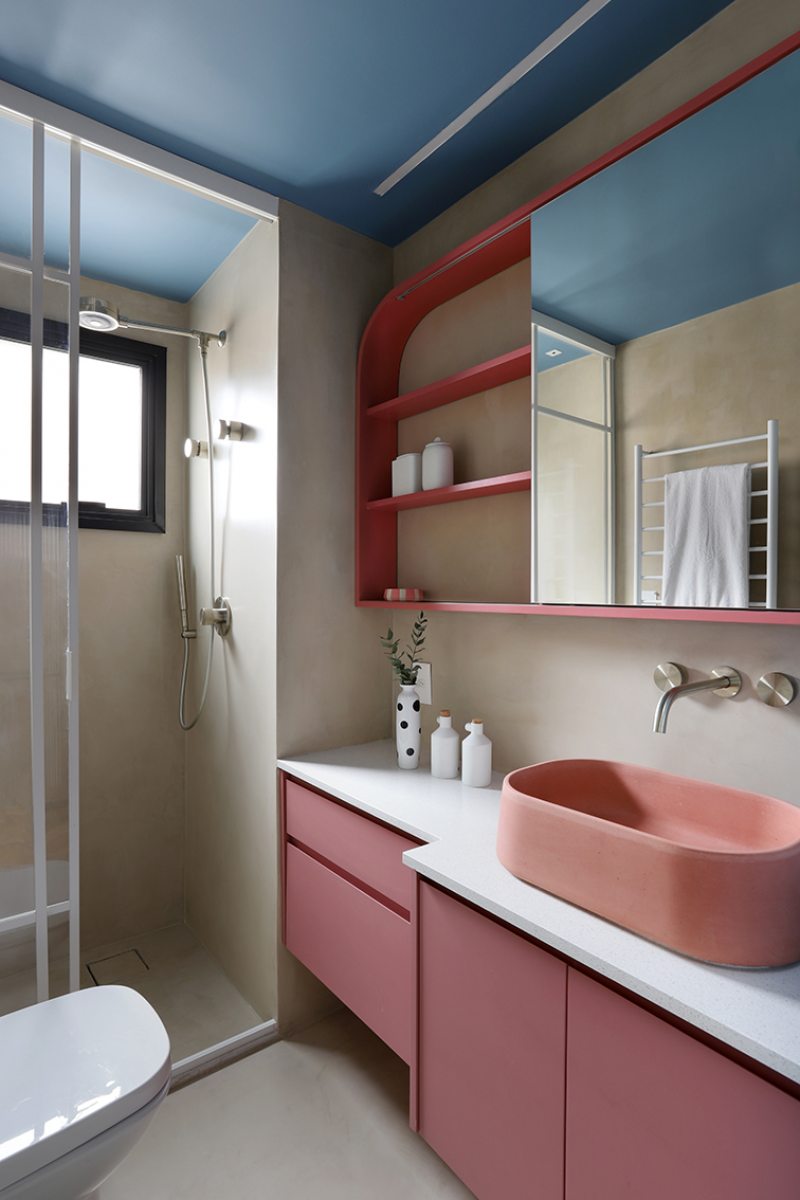 O banheiro da suíte reúne diferentes cores em marcenaria e acabamentos. A porta segue o mesmo tom verde utilizado no quarto e, internamente, o azul Tarde em Veneza da Coral aparece no teto. A bancada em Silestone branco recebe cuba em concreto rosa queimado, com armários inferiores em rosa e moldura no armário espelhado no mesmo tom. No box, um nicho vertical em serralheria com prateleiras finas e iluminação interna em LED organiza os itens de banho. Piso e paredes foram finalizados em microcimento.