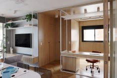 Dos dois quartos originais do apartamento, um foi integrado à sala. A parede foi removida e substituída por um móvel multifuncional desenhado pelo escritório, que funciona como bancada e mesa de trabalho. Nesse espaço, a moradora utiliza a máquina de costura para desenvolver suas coleções.