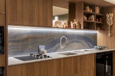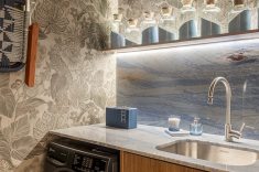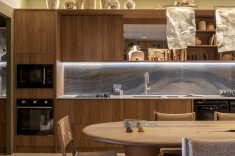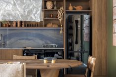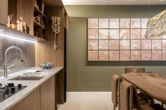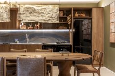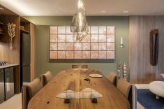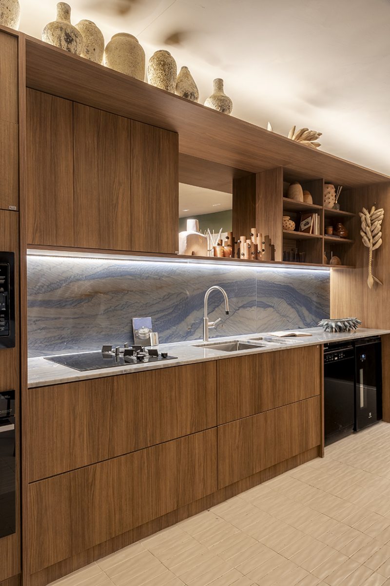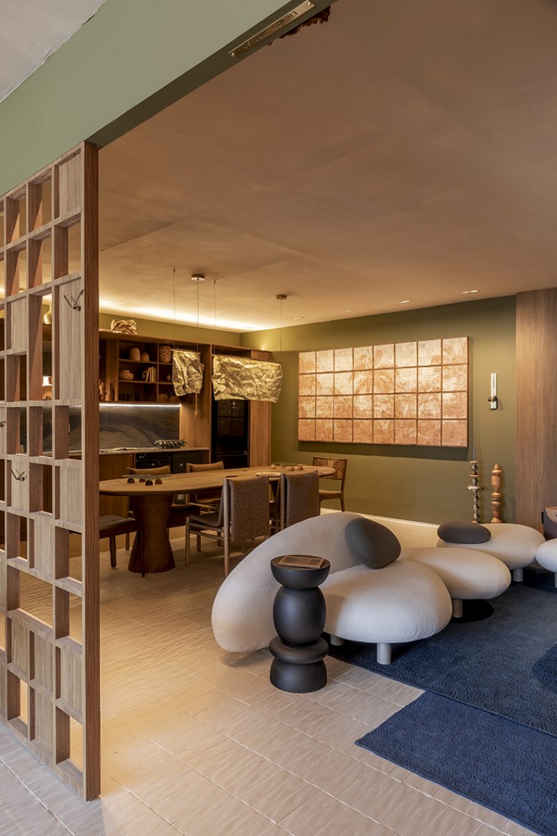 Desenvolvida para um imóvel em São Paulo, a Casa Corcovado parte da ideia de transportar essa atmosfera carioca para outro contexto urbano. O projeto acentua referências simbólicas da paisagem do Rio — especialmente a relação entre mar e floresta. A proposta também nasce de uma história específica: o ambiente foi concebido como uma homenagem a Laís e Vinícius, cariocas que hoje vivem fora da cidade natal. A arquitetura aparece, assim, como um elo entre lugares e afetos, revelando a força das referências locais mesmo quando deslocadas para novos contextos.