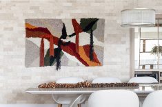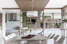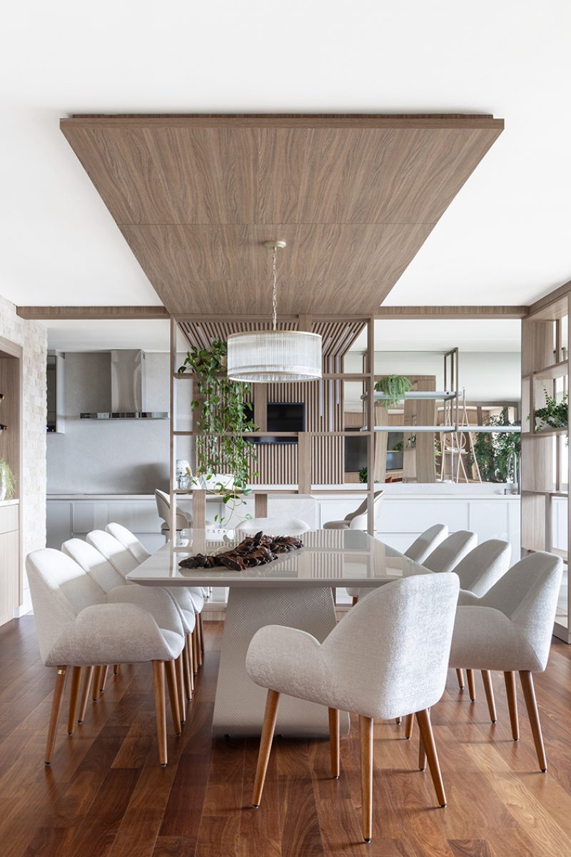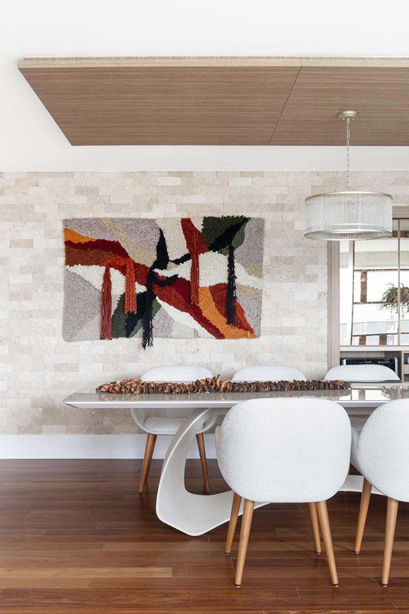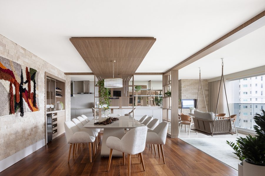 O primeiro gesto do projeto foi abrir os ambientes: integrar cozinha, sala de jantar e varanda para favorecer a convivência e a luz. A base neutra — com piso de madeira, painéis e teto amadeirados — cria continuidade visual e sustenta a paleta de tons terrosos, com pontos de verde e texturas naturais. A iluminação é automatizada, com cenas ajustáveis conforme o uso. O mobiliário combina itens da Sierra e Masotti.