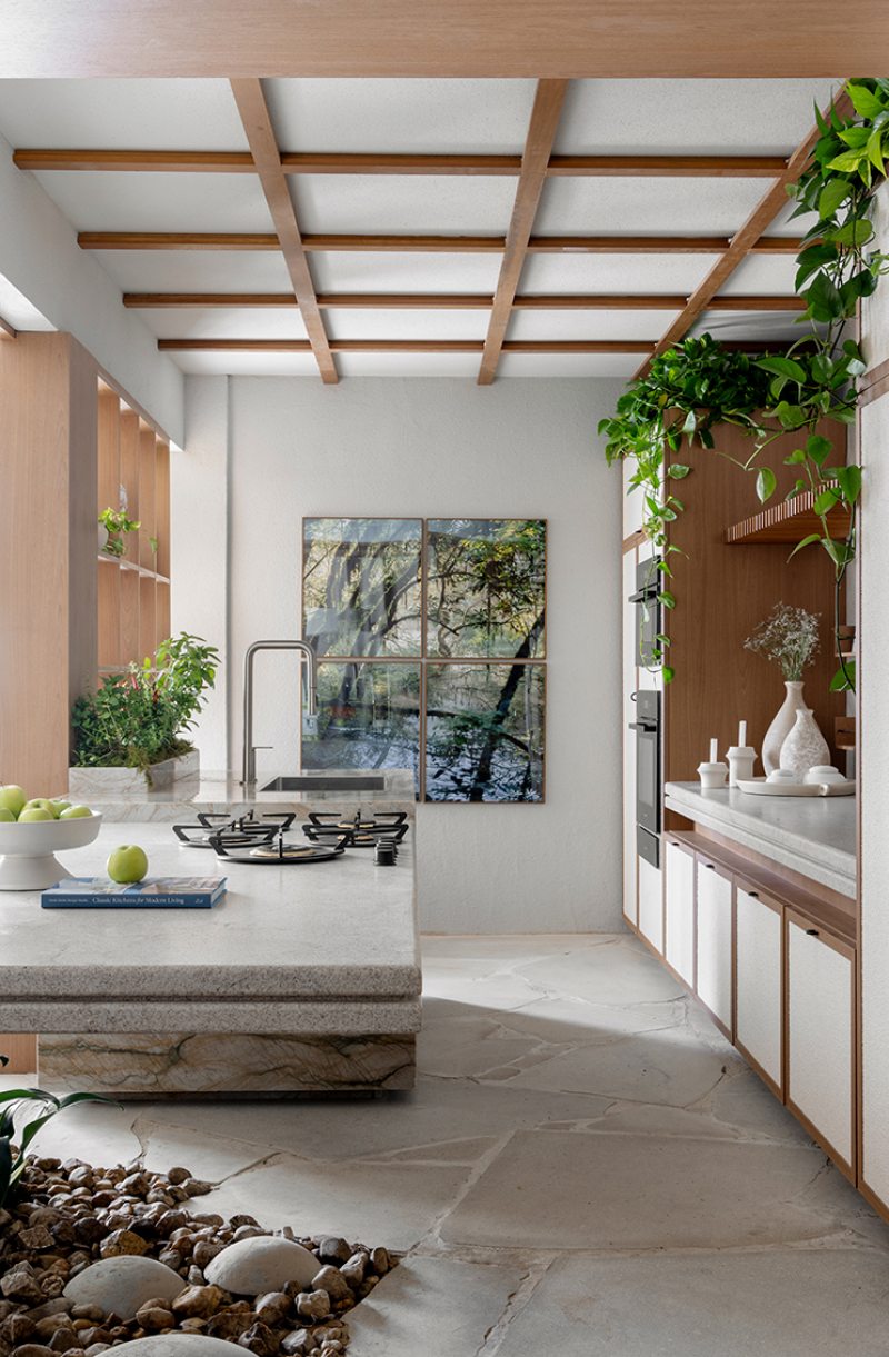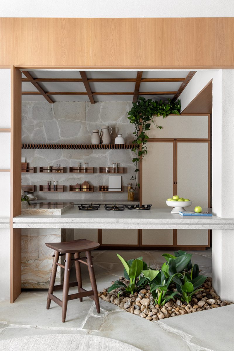 O projeto reflete sobre o que é essencial e o que é supérfluo. A passagem do tempo está expressa nos materiais naturais que revelam veios, texturas e marcas de uso — uma escolha intencional que valoriza a verdade da matéria e a durabilidade como atributos de beleza.