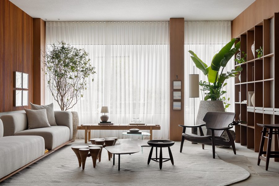A paleta em tons terrosos, beges e fendi reforça o caráter atemporal do ambiente, enquanto o piso em pedra natural e os revestimentos minerais ampliam a sensação de solidez. A iluminação em camadas, composta por LED automatizado e luz difusa filtrada por uma malha de madeira no teto, atua como narrativa — destaca texturas, adapta atmosferas e otimiza o consumo energético.
