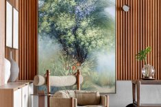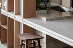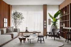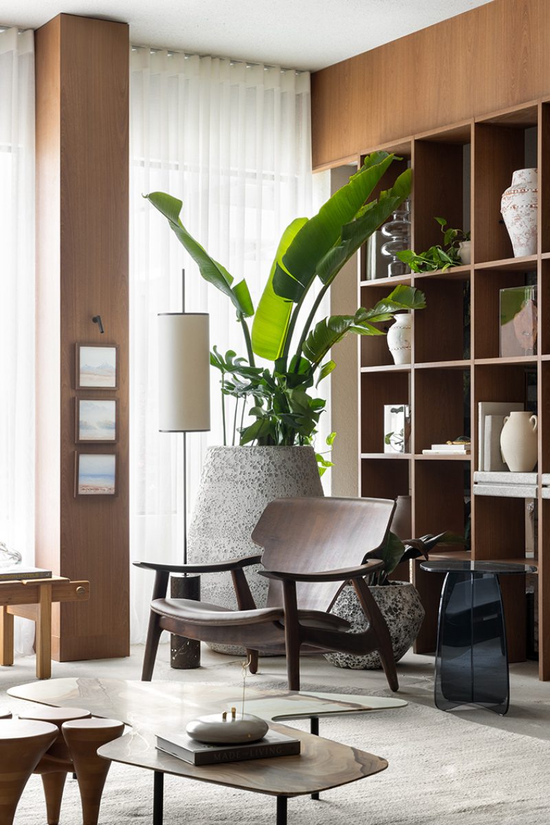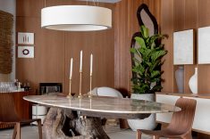 A madeira, protagonista do espaço, aparece em painéis abaulados e superfícies contínuas, em diálogo com o quartzito Capadócia da mesa de jantar, criada em parceria com a Residual Design e a MG3 Mármores. A base da peça, esculpida a partir de um tronco reaproveitado, sintetiza o conceito do projeto: memória, autenticidade e permanência.