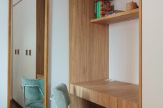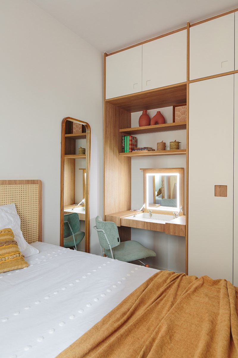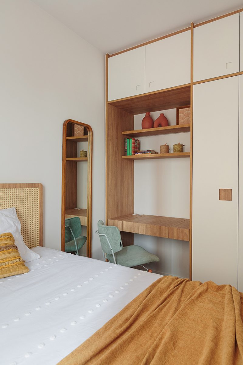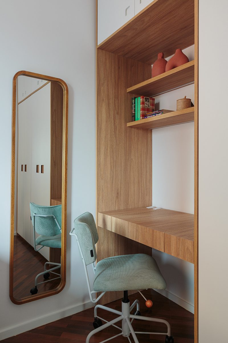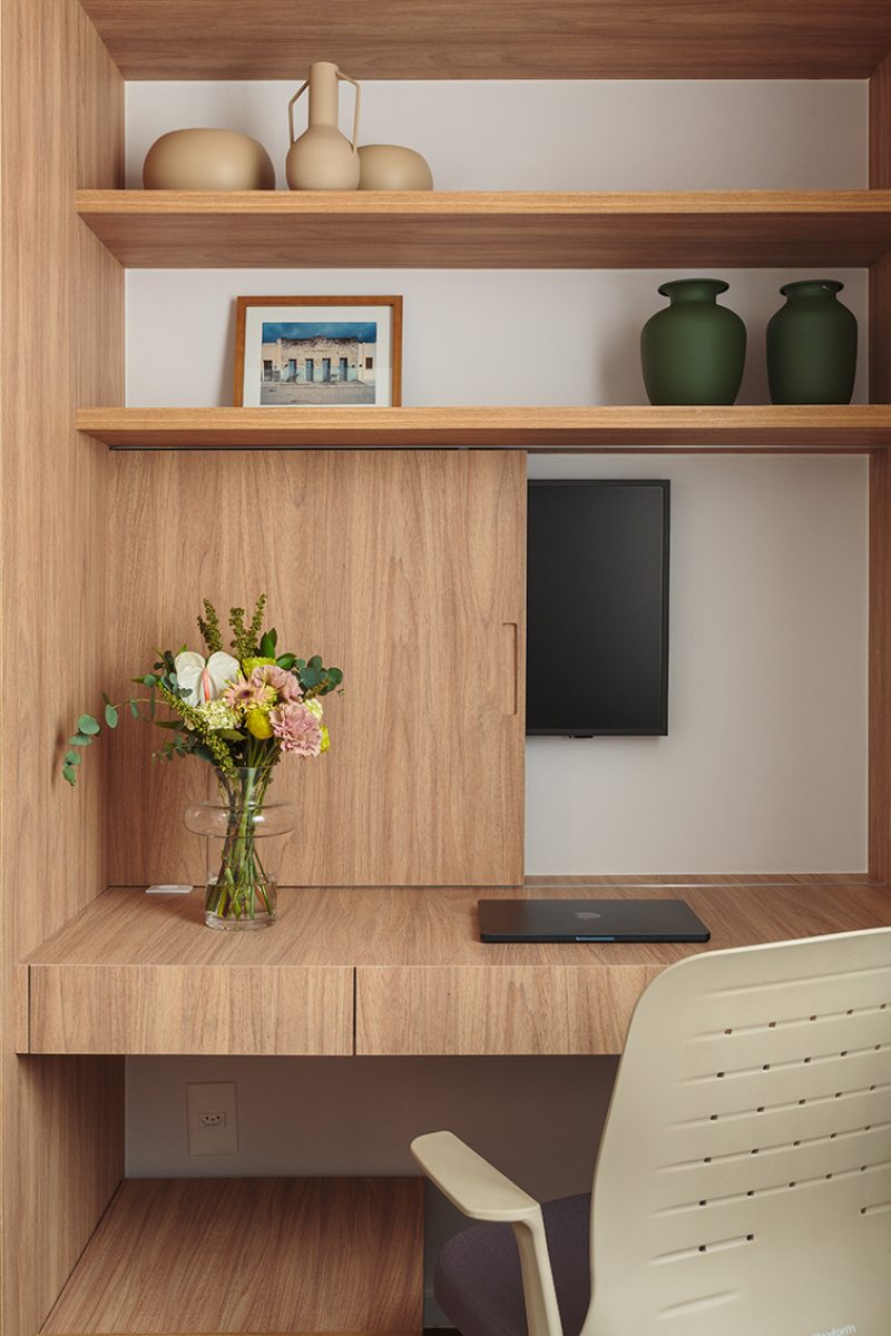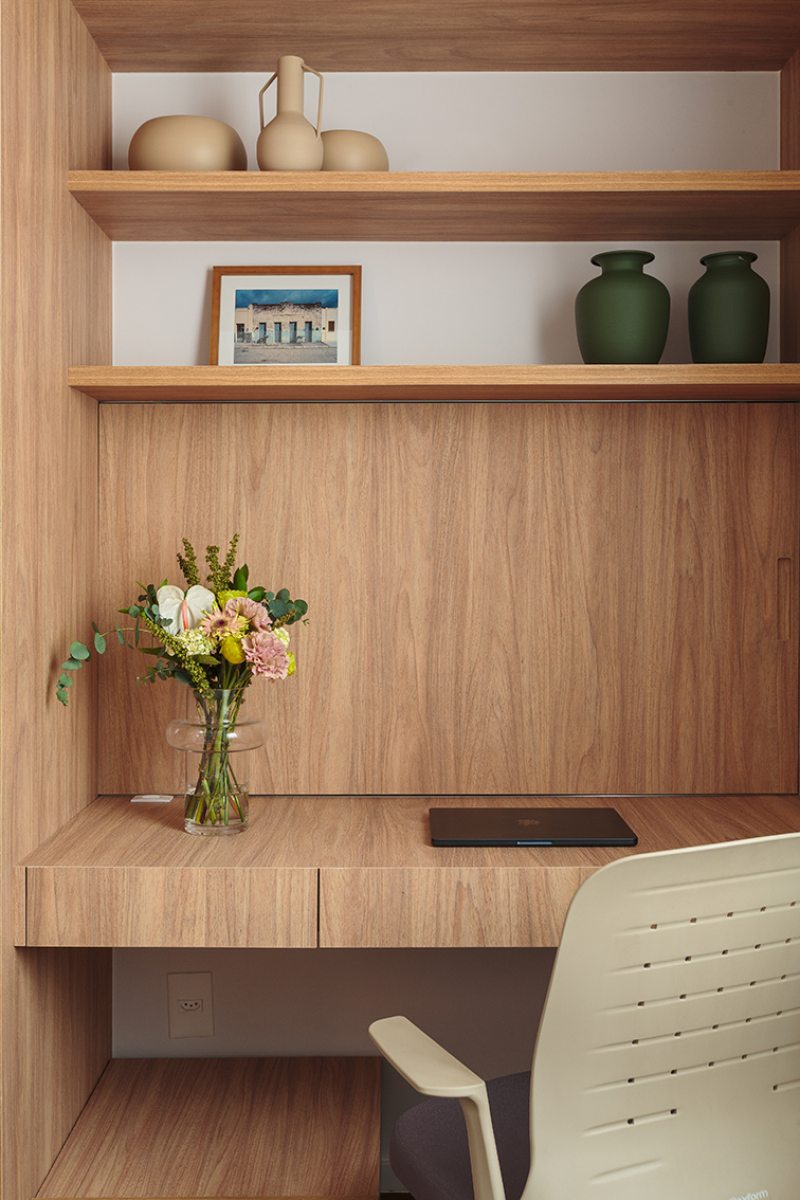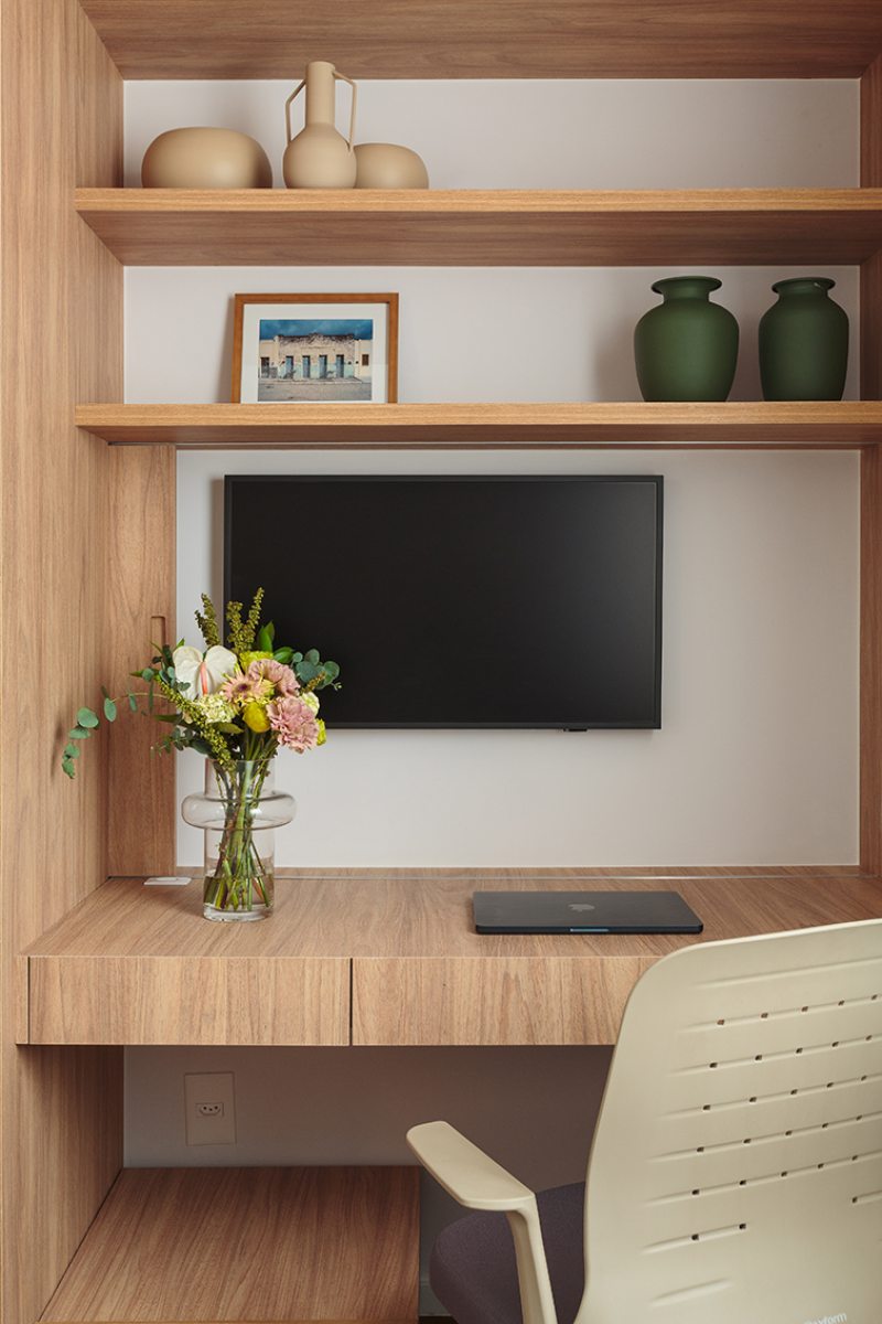 Na suíte principal, o painel de madeira da bancada de trabalho tem porta de correr que esconde a televisão, deixando o ambiente mais leve e integrado. Uma ideia perfeita para quem precisa conciliar rotina profissional e descanso no mesmo espaço.