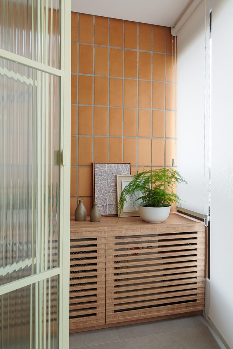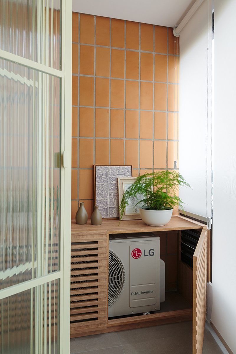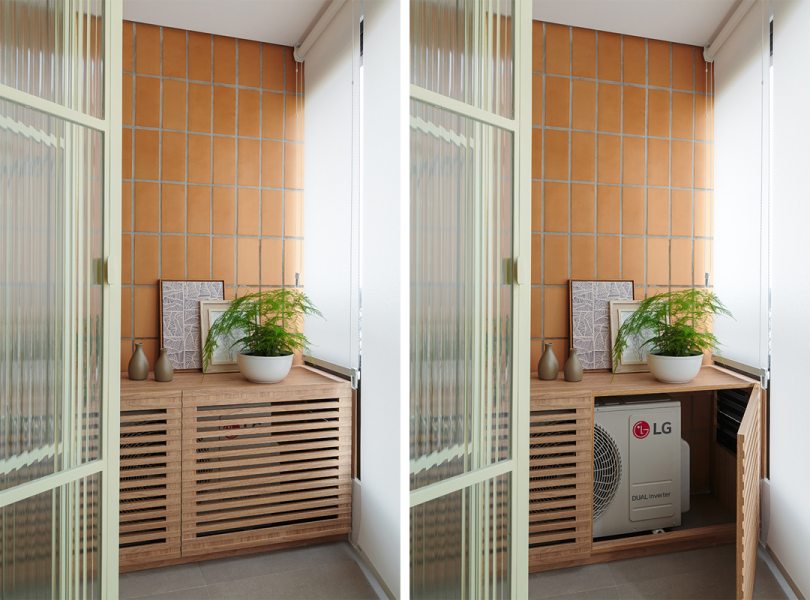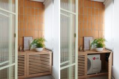 A sacada ganhou um móvel ripado que disfarça o condensador do ar-condicionado e ainda funciona como aparador decorativo. As frestas garantem ventilação e reforçam o caráter estético do projeto.