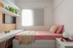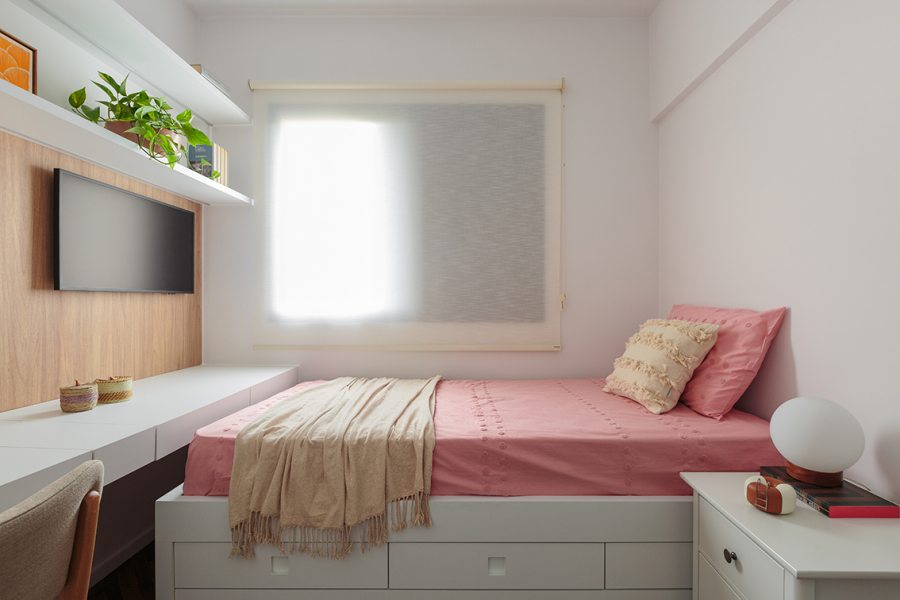 Os gavetões embutidos sob a cama ampliam o armazenamento. Uma solução prática e visualmente integrada, que substitui cômodas e otimiza o espaço no quarto.