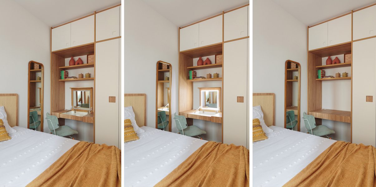 Com tampo móvel que esconde o espelho, a penteadeira se transforma em uma bancada neutra quando fechada. O móvel é compacto, funcional e se adapta às diferentes rotinas do dia a dia.