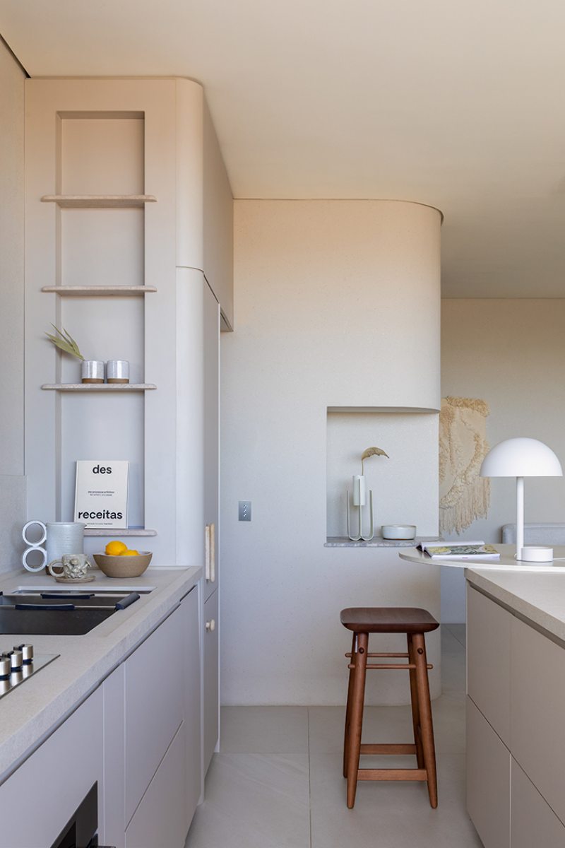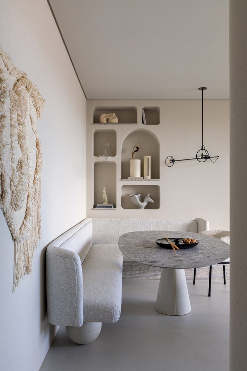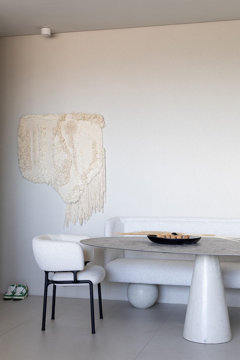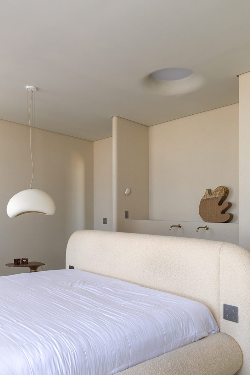 Relevos verticais, superfícies levemente granuladas, tecidos encorpados, pedra natural e madeira clara criam variações sutis que enriquecem o espaço sem romper a unidade visual. A arquitetura está baseada na continuidade e na percepção sensorial dos materiais para dar profundidade aos ambientes. A proposta se organiza em torno de uma paleta quase contínua de tons claros — beges, off-whites e superfícies minerais que parecem pertencer à mesma família cromática.