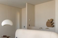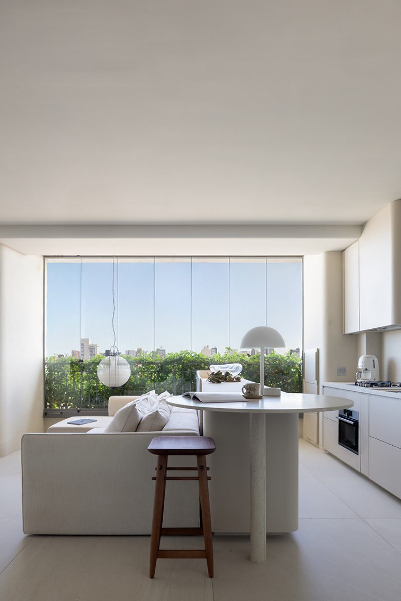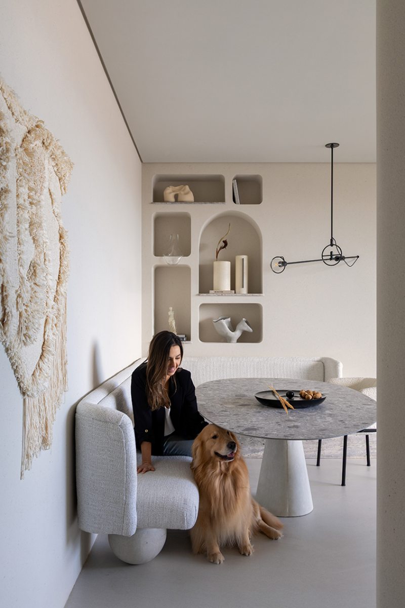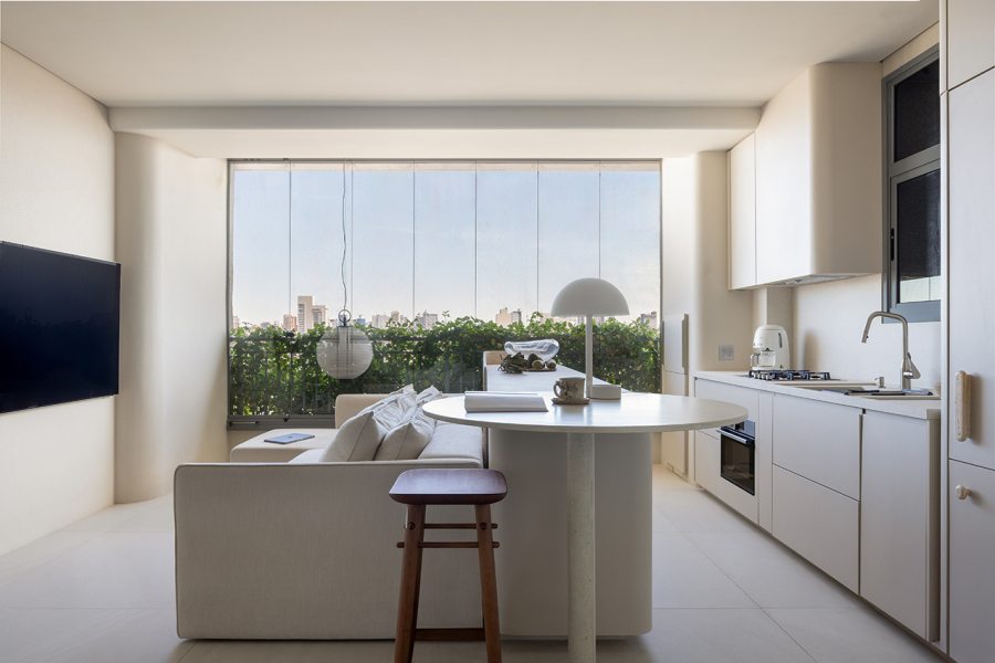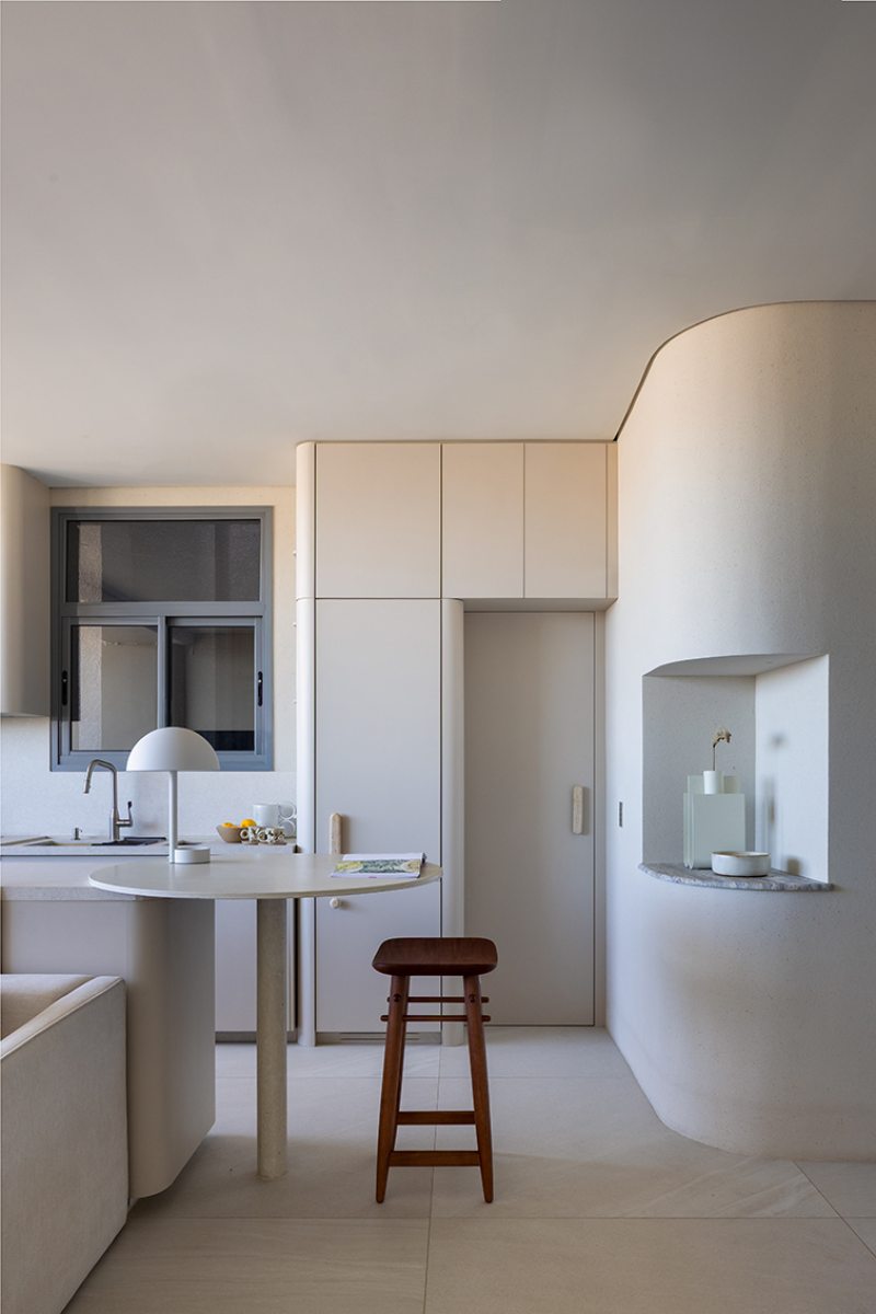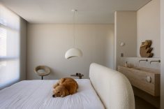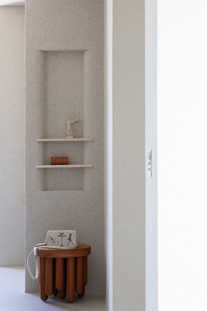 Relevos verticais, superfícies levemente granuladas, tecidos encorpados, pedra natural e madeira clara criam variações sutis que enriquecem o espaço sem romper a unidade visual. A arquitetura está baseada na continuidade e na percepção sensorial dos materiais para dar profundidade aos ambientes. A proposta se organiza em torno de uma paleta quase contínua de tons claros — beges, off-whites e superfícies minerais que parecem pertencer à mesma família cromática.