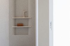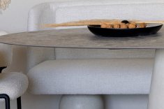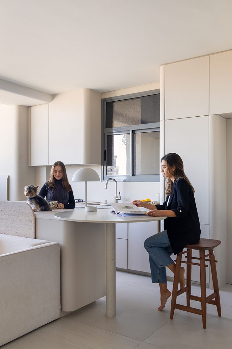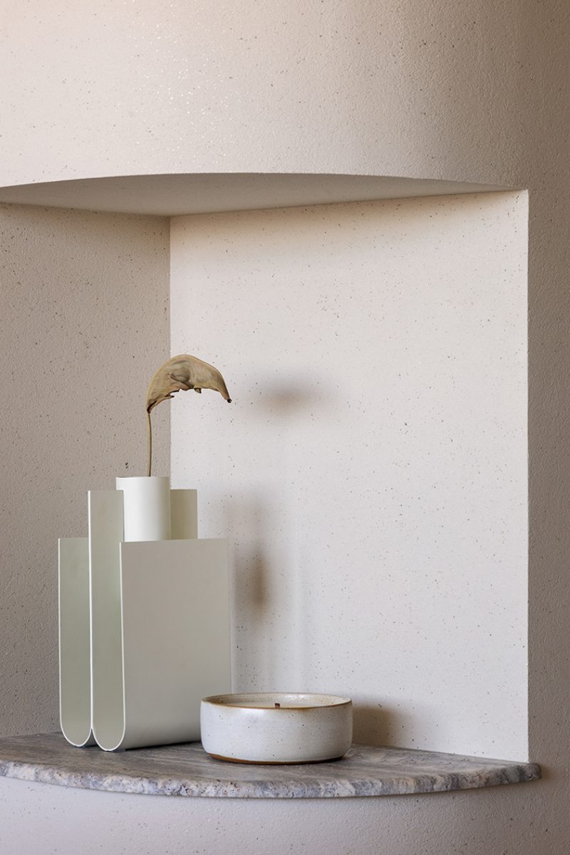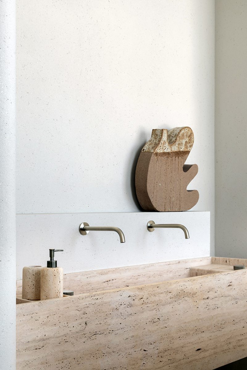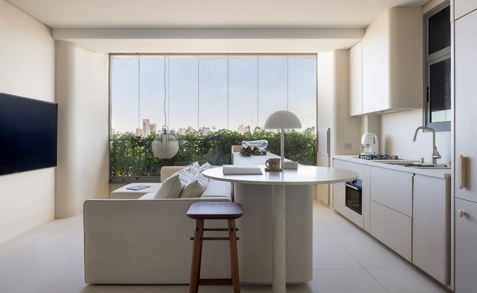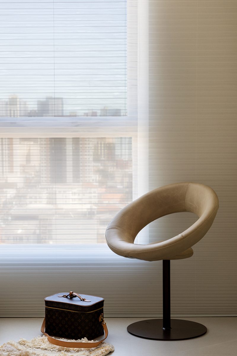 Relevos verticais, superfícies levemente granuladas, tecidos encorpados, pedra natural e madeira clara criam variações sutis que enriquecem o espaço sem romper a unidade visual. A arquitetura está baseada na continuidade e na percepção sensorial dos materiais para dar profundidade aos ambientes. A proposta se organiza em torno de uma paleta quase contínua de tons claros — beges, off-whites e superfícies minerais que parecem pertencer à mesma família cromática.
