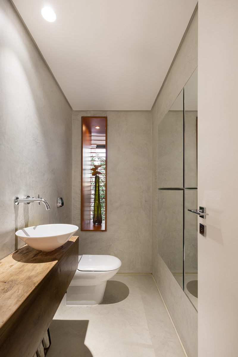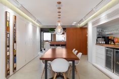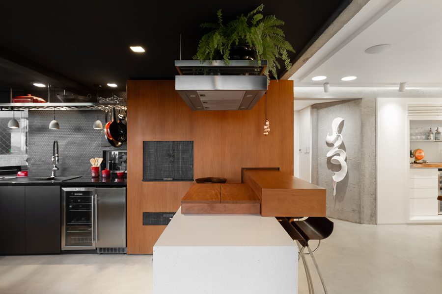 O posicionamento do layout gourmet também não favorecia a uma boa integração dos anfitriões com os visitantes”, conta Volpato. O partido se define no encontro de materiais naturais e acabamentos, no contraste da brutalidade do concreto aparente da estrutura com o sutil destaque do forro e suas arestas precisas.