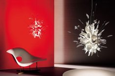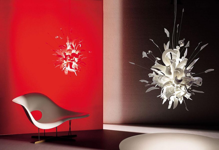 Luminária criada em 1994, feita com pratos e porcelanas quebrados, poesia luminosa em forma de caos. Cada peça é única e feita artesanalmente.