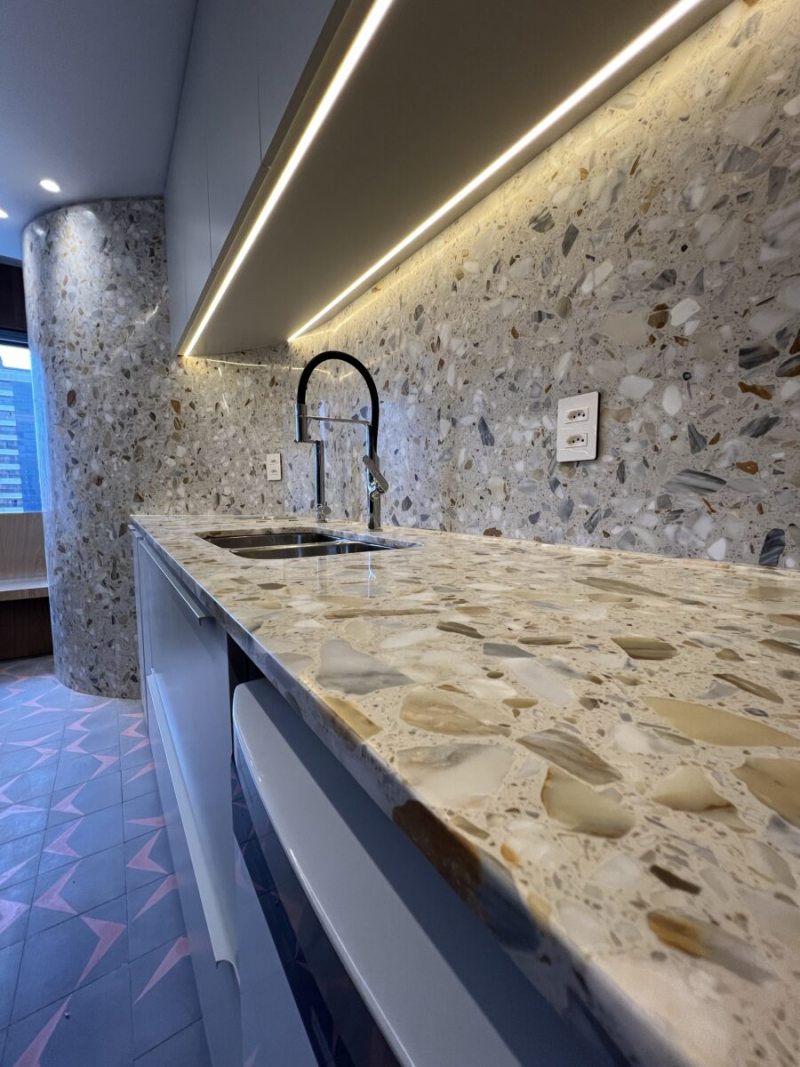 Mais recente no mercado brasileiro, o terrazzo resinado resgata a estética clássica italiana em versões contemporâneas. Para a arquiteta Silvia Xavier, trata-se de uma solução diferenciada: “Tenho utilizado o Terraço Resina da Santa Margherita, que combina resina e resíduos de rochas com um processo técnico e artesanal. Isso confere muita resistência e um visual que traz essa vibe europeia do terrazzo, mas com a durabilidade necessária para tampos de cozinha”.