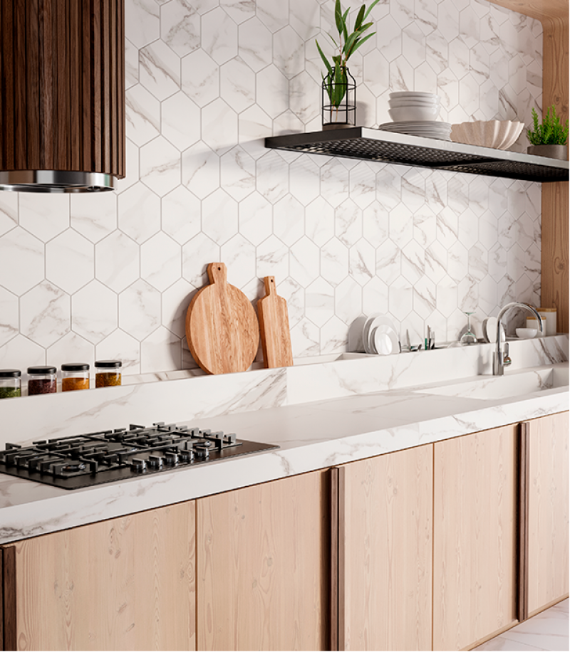 O porcelanato em superformatos é uma alternativa com custo mais acessível que as superfícies sinterizadas, apresentando versatilidade de aplicação e boa resistência. A Roca Cerámica, por exemplo, trouxe ao mercado placas de grandes dimensões capazes de atender ao mesmo conceito estético. No entanto, apesar do desempenho satisfatório, esse tipo de material pode demandar maior cuidado na instalação para evitar quebras e trincas.