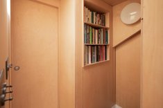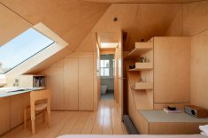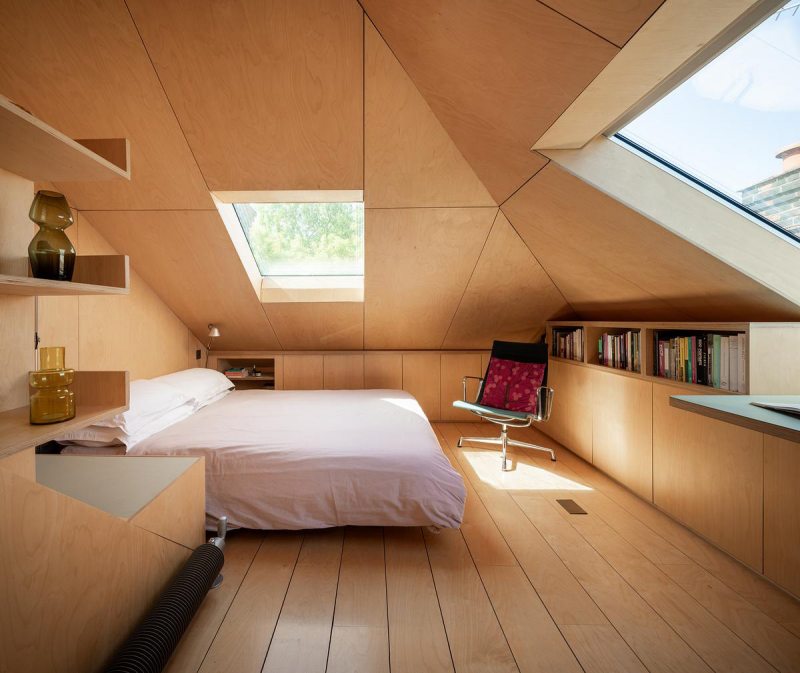 Neste projeto a madeira envolve continuamente paredes, tetos e elementos embutidos, criando uma sensação de encerramento que transmite estabilidade e calma. As superfícies revestidas com placas de MDF funcionam como um gesto único e contínuo. As junções são cuidadosamente resolvidas, permitindo que o desenho fale por meio da precisão. A uniformidade do material dilui a complexidade da geometria e transforma a inclinação do telhado em elemento organizador. O mesmo material reveste a marcenaria feita sob medida.