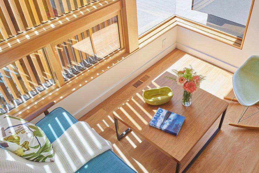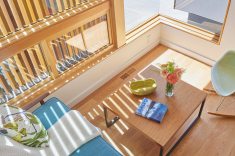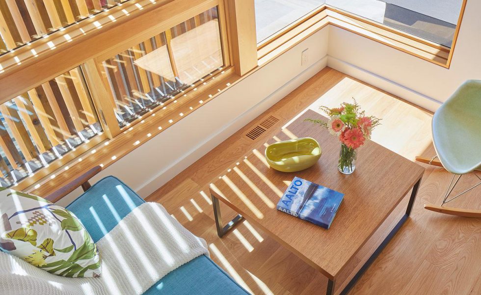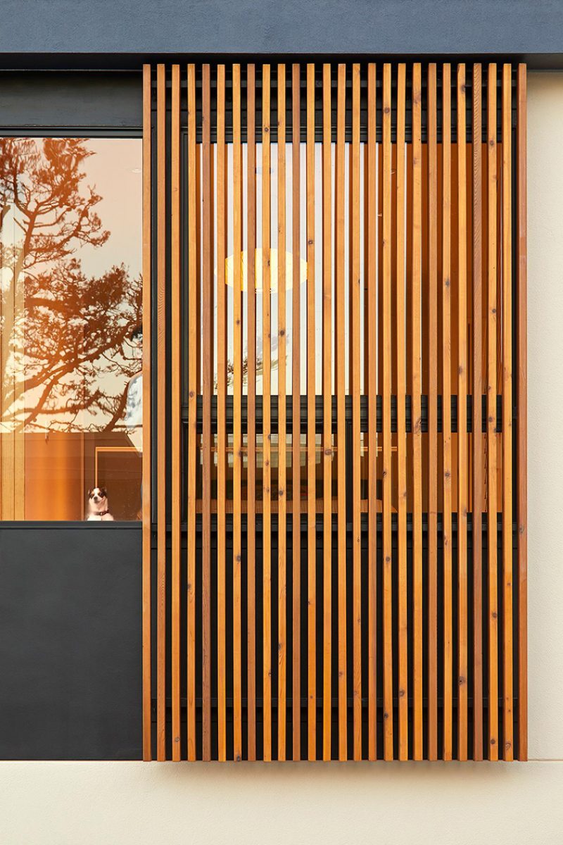 Elementos de design como telas de madeira foram empregados para permitir a entrada de luz natural, ao mesmo tempo em que garantem a privacidade necessária em relação à rua. Um canto envidraçado foi estrategicamente posicionado para emoldurar a vista deslumbrante das colinas circundantes. Adicionalmente, uma claraboia sobre a escada confere uma sensação de verticalidade, unindo o novo espaço ao existente de forma coesa.