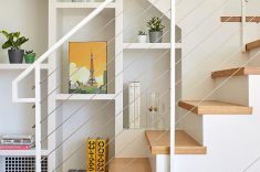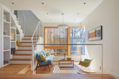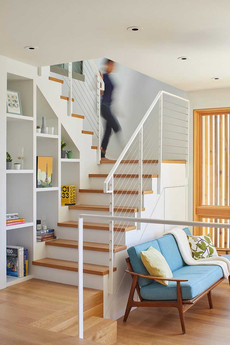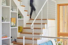 A tipologia comum dessas casas envolve um volume principal elevado sobre uma coluna de concreto, um muro de contenção e uma garagem, o que geralmente resulta em um espaço subutilizado no nível da rua. A KOAMI ARCHITECTURE transformou esse "vazio" em um ponto focal de design. O espaço antes negligenciado foi revitalizado, convertendo-se em uma sala de família vibrante e acolhedora. Essa nova área se conecta harmoniosamente ao espaço principal da casa por meio de uma escada interna.
